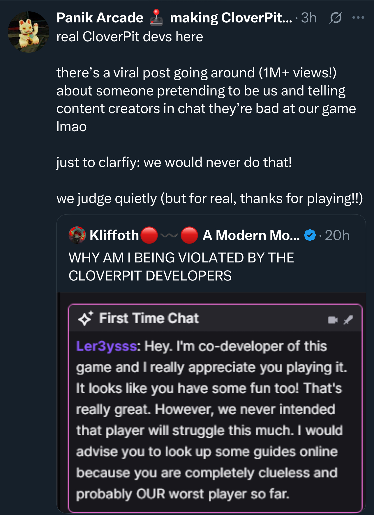 Kliffoth claimed the Cloverpit devs were in his chat and apparently they weren’t. Did he lie, was it a joke, or was he fooled?