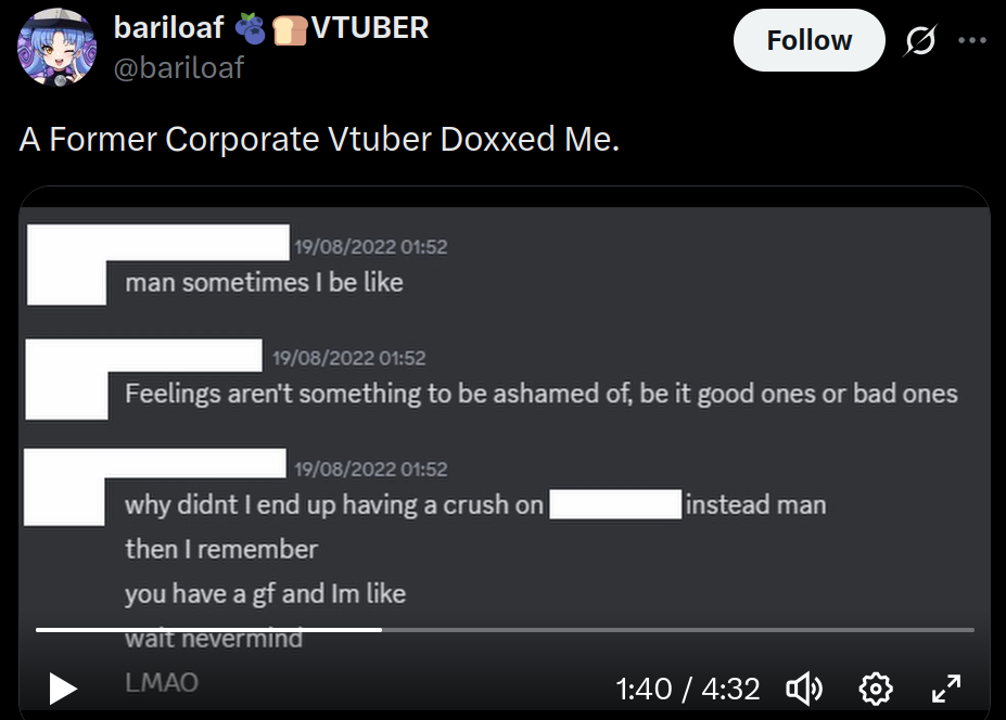 When will people learn not to date your co-workers? Because if the relationship broke down, your career and life is most likely gonna derail too.If i was a vtuber, i would not date anyone who is even marginally connected to the circle.