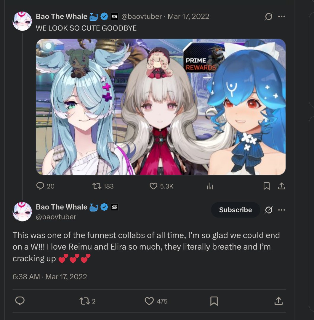 >>105851435>If that was true then girls only collabs would be unpopular too and they obviously aren't.Holo girls collabing with each other? You’re right that they’re not unpopular and the reason for that is that most of the Holo audience might have an oshi but really likes the whole cast. Outside of Hololive? You don’t need to look further than the drop in interest when it starts happening too often and, incidentally, that was one of the things that costed Matsuri a lot of her audience.