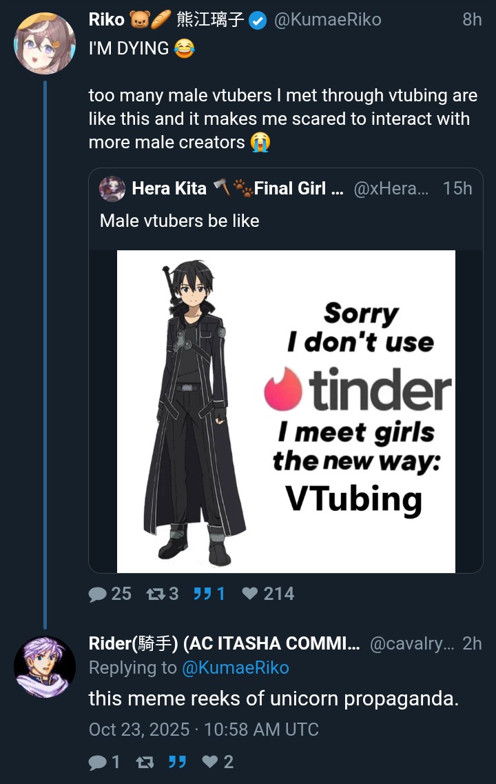 >>105851638JP certainly is different. None of the EN's would be getting away with this without catching shit forever afterwards. Its why even with shiori, she just calls them faggots if they do collab and erb...uh I dunno how those go, no one really watches her.