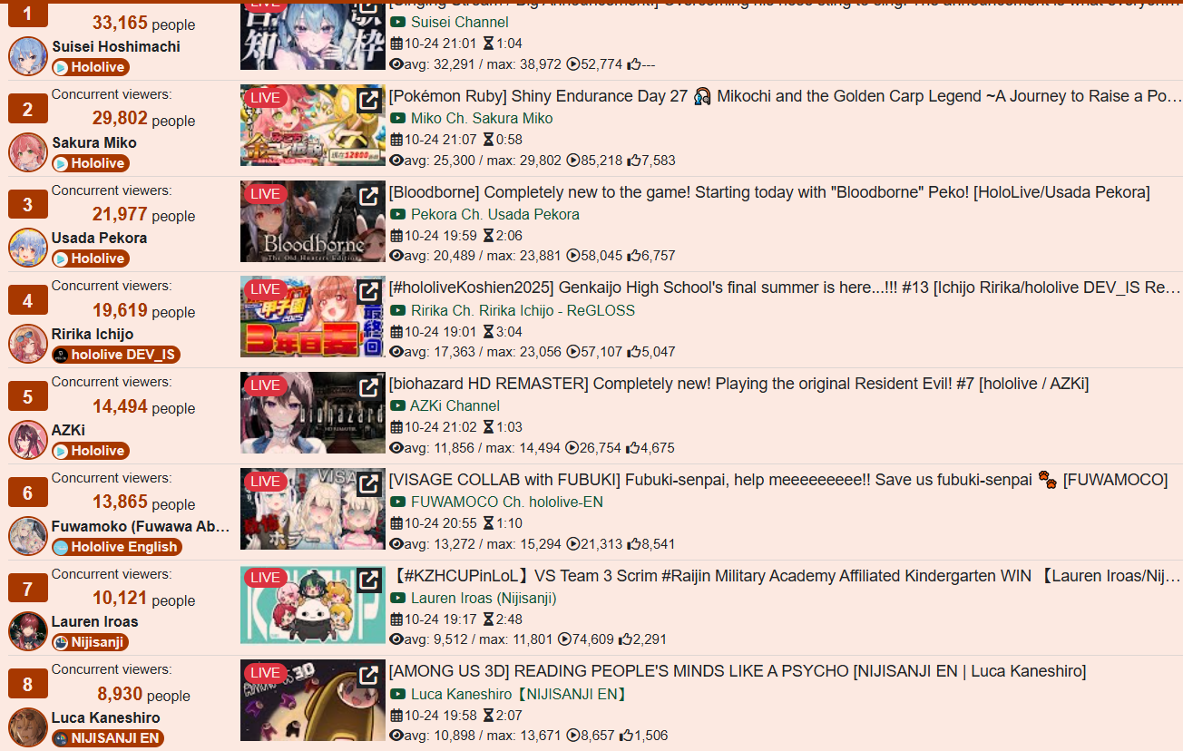 *GENERAL NUMBERFAG SITES*>https://playboard.co/en/>http://ikioi-ranking.com/>https://vrabi.net/>https://www.vstats.jp>https://live-ranking.userlocal.jp/vtuber-ranking>https://vt.poi.cat/Hololive sites>https://www.hololyzer.net/youtube/index.html>https://trackholo.live/en/>https://holo-spotify-stats.jirikunes.eu/Twitch sites>https://sullygnome.com/>https://twitchtracker.com/>https://stats.roki.sh/>https://streamscharts.com/