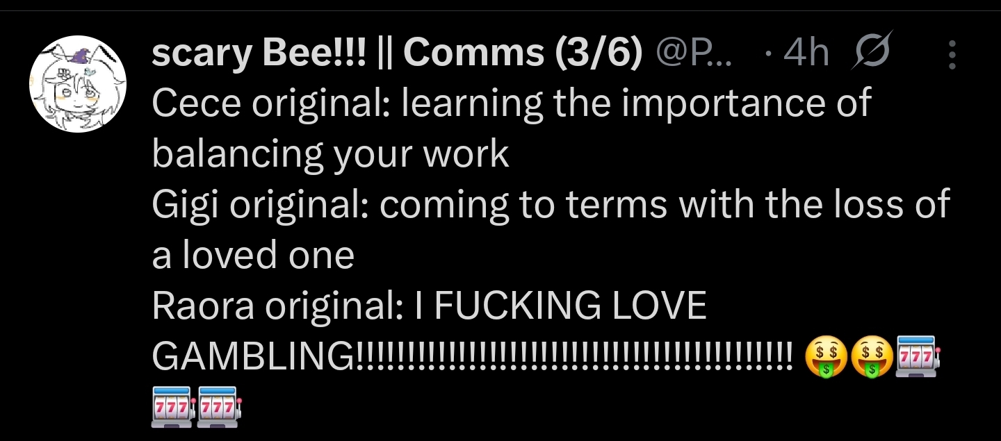 >>105883472>Gigi>Reaching out to someoneLmao, you have better chance for her to goon to Yuri than that happening >>105883432GG has been a peculiarity for the JPs, ever since her antics like JP new year puzzle event, 3D and mentions on Koyoasa there is some interest in her by the JPs, it's just that she seems to not respond in kind for the fear of the language barrier
