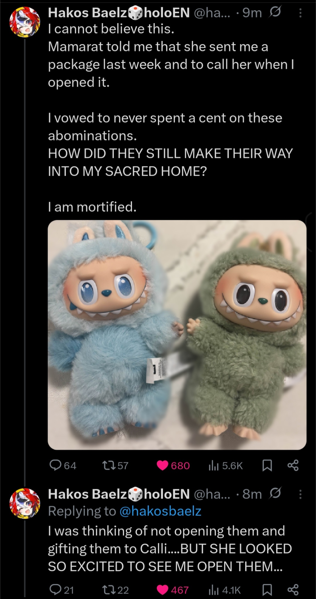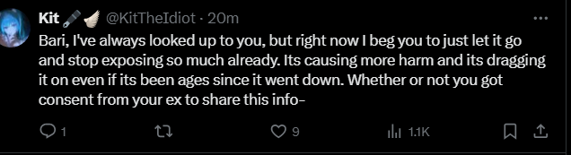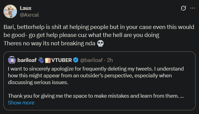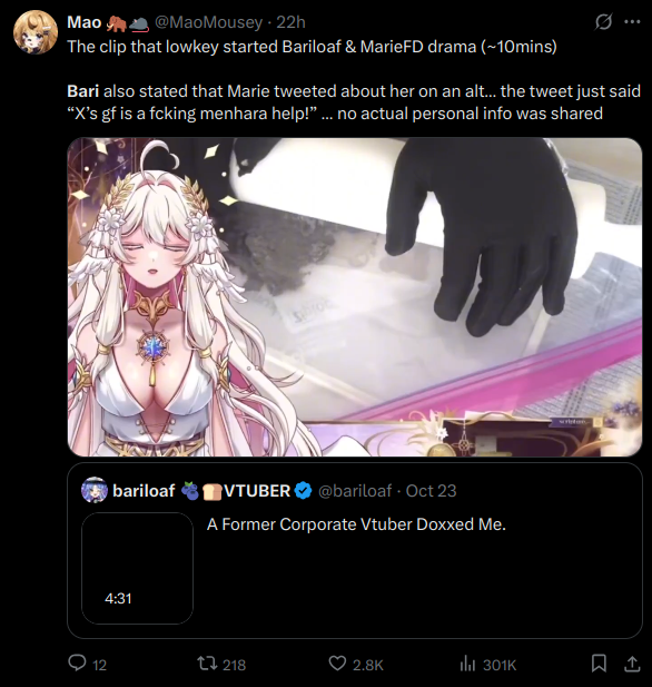 >>105889159Vox is a sexpest and bari went scorched earth her recent dockey. Also doki bird followed Bari