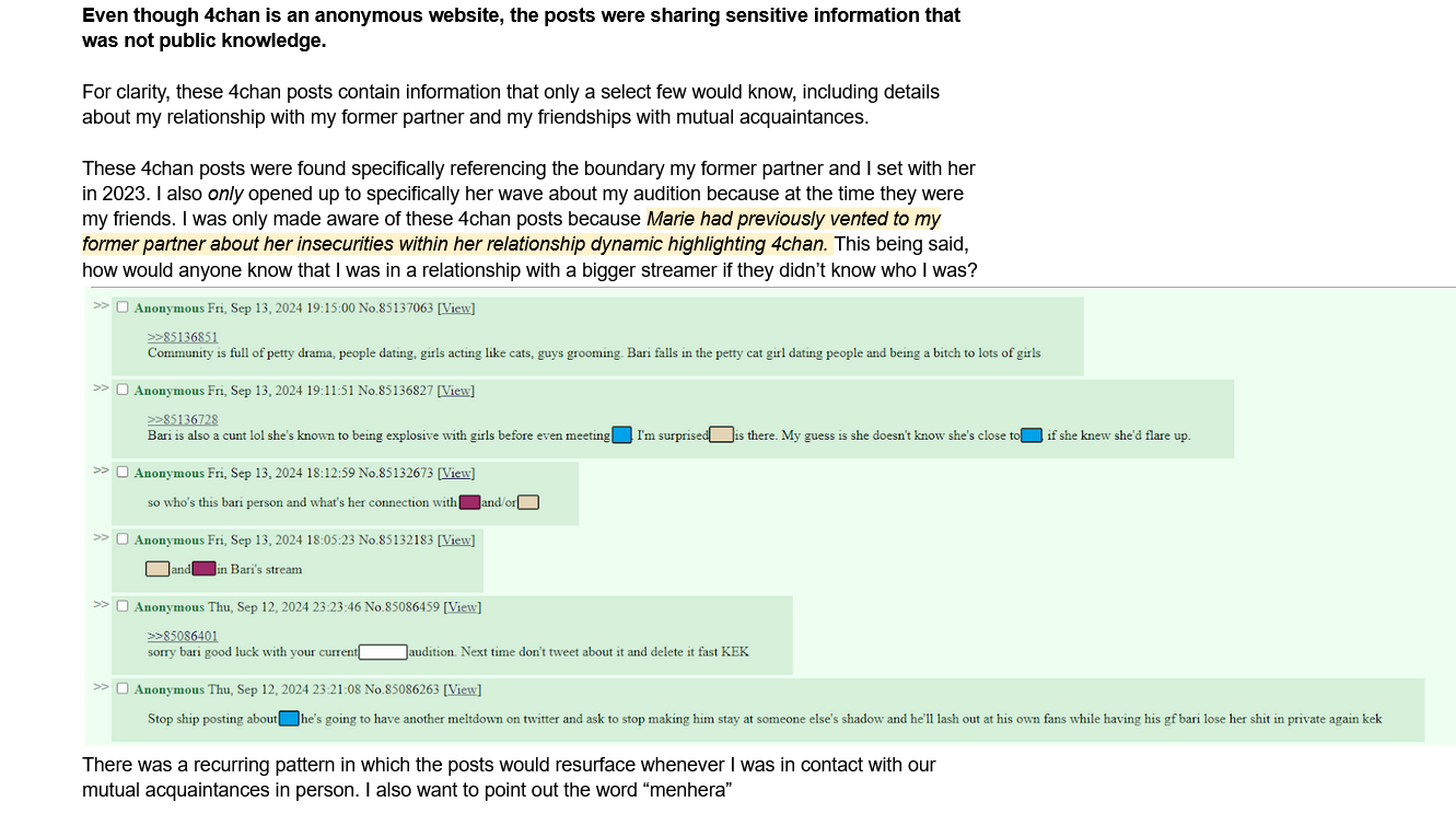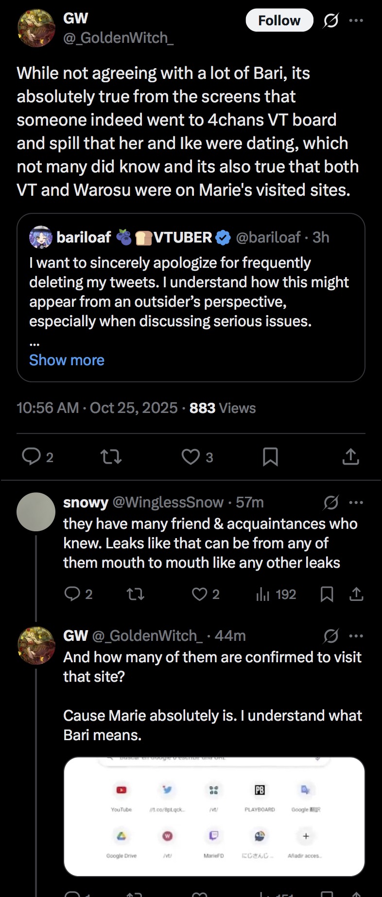 > While not agreeing with a lot of Bari, its absolutely true from the screens that someone indeed went to 4chans VT board and spill that her and Ike were dating, which not many did know and its also true that both VT and Warosu were on Marie's visited sites.UH-OH….That’s one amusing thing out of all of this: not only the “ALL OUT WAR” had a /vt/ component but at the same time NijiEN was using the board as a weapon against their enemies.