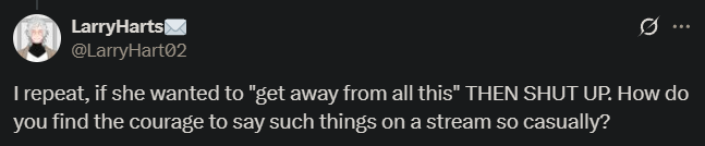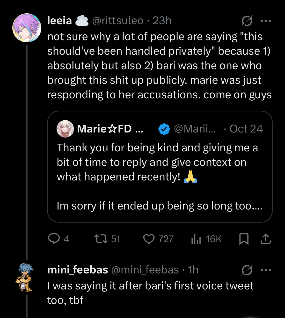 >>105888771But the rest of the replies to that tweet were all in support of Marie saying whatever she felt she had to say because it's an anecdote so it's okay...