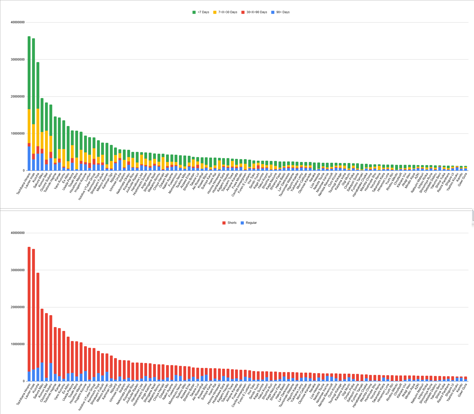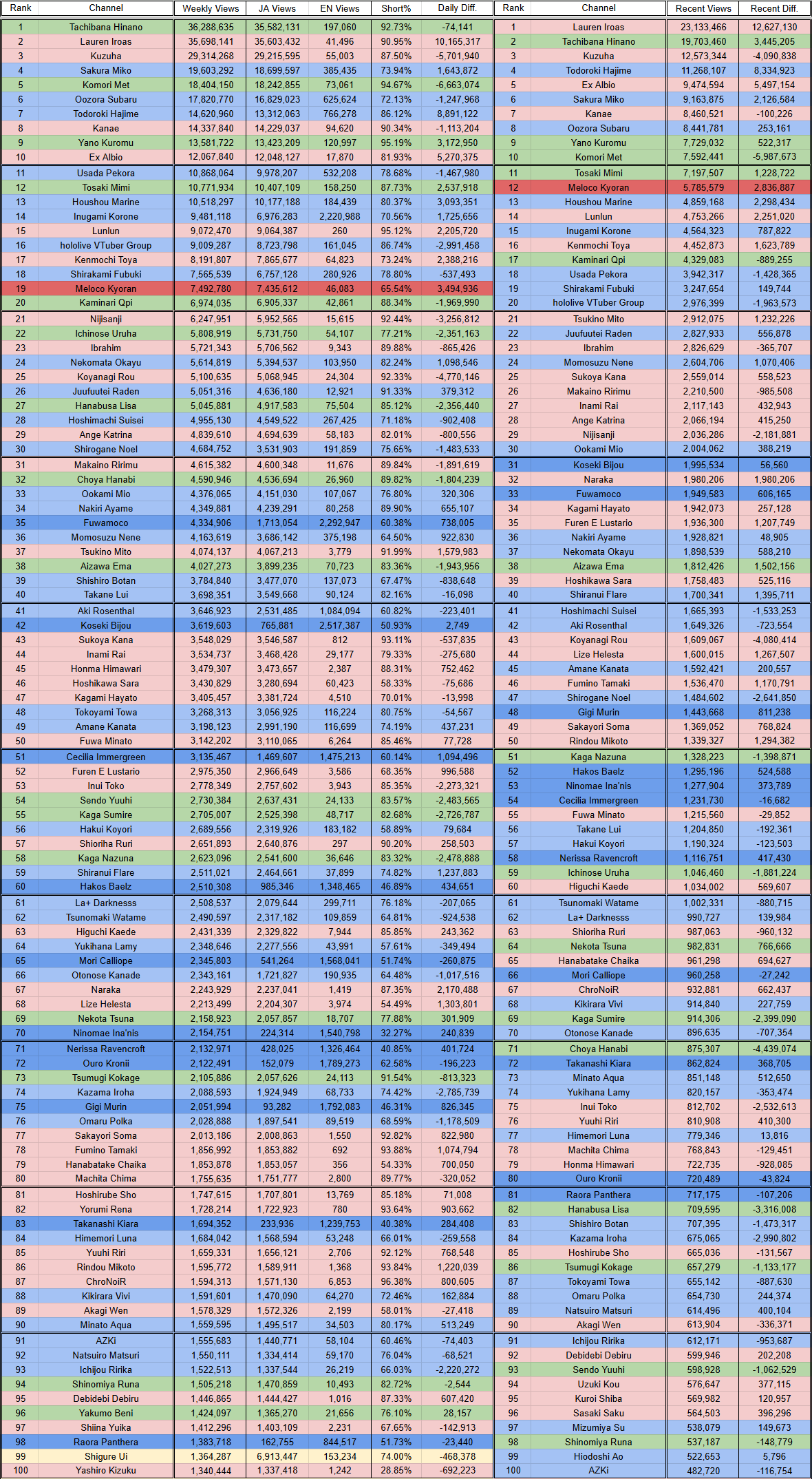 More clip numbers.(HL, NJ, VS)Split is 230.3M(+800k), 249.2M(+8.1M), 126.3M(-21.8M)Recent is 103.0M(+1.4M), 125.7M(+15.9M), 57.3M(-17.1M)JA Split is 183.1M(+80k), 245.3M(+8.1M), 123.4M(-21.7M)EN Split is 35.1M(+3.2M), 2.2M(-330k), 1.3M(-10k)Regular Split is 66.2M(-3.7M), 45.0M(-1.7M), 13.8M(-1.5M)Shorts Split is 164.1M(+4.5M), 204.1M(+9.8M), 112.4M(-20.3M)