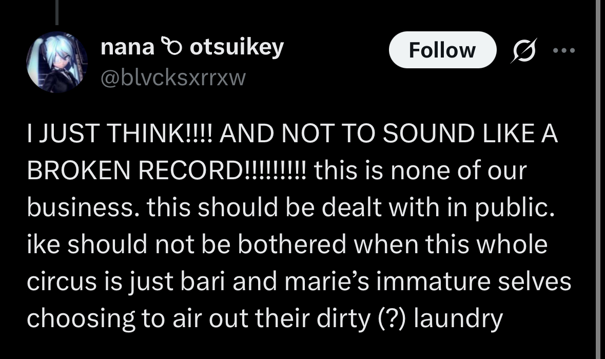 >I JUST THINK!!!! AND NOT TO SOUND LIKE A BROKEN RECORD!!!!!!!!! >this is none of our business. this should be dealt with in public. >ike should not be bothered when this whole circus is just bari and marie’s immature selves choosing to air out their dirty (?) laundryTOP KEK, nijisisters trying their best to damage control