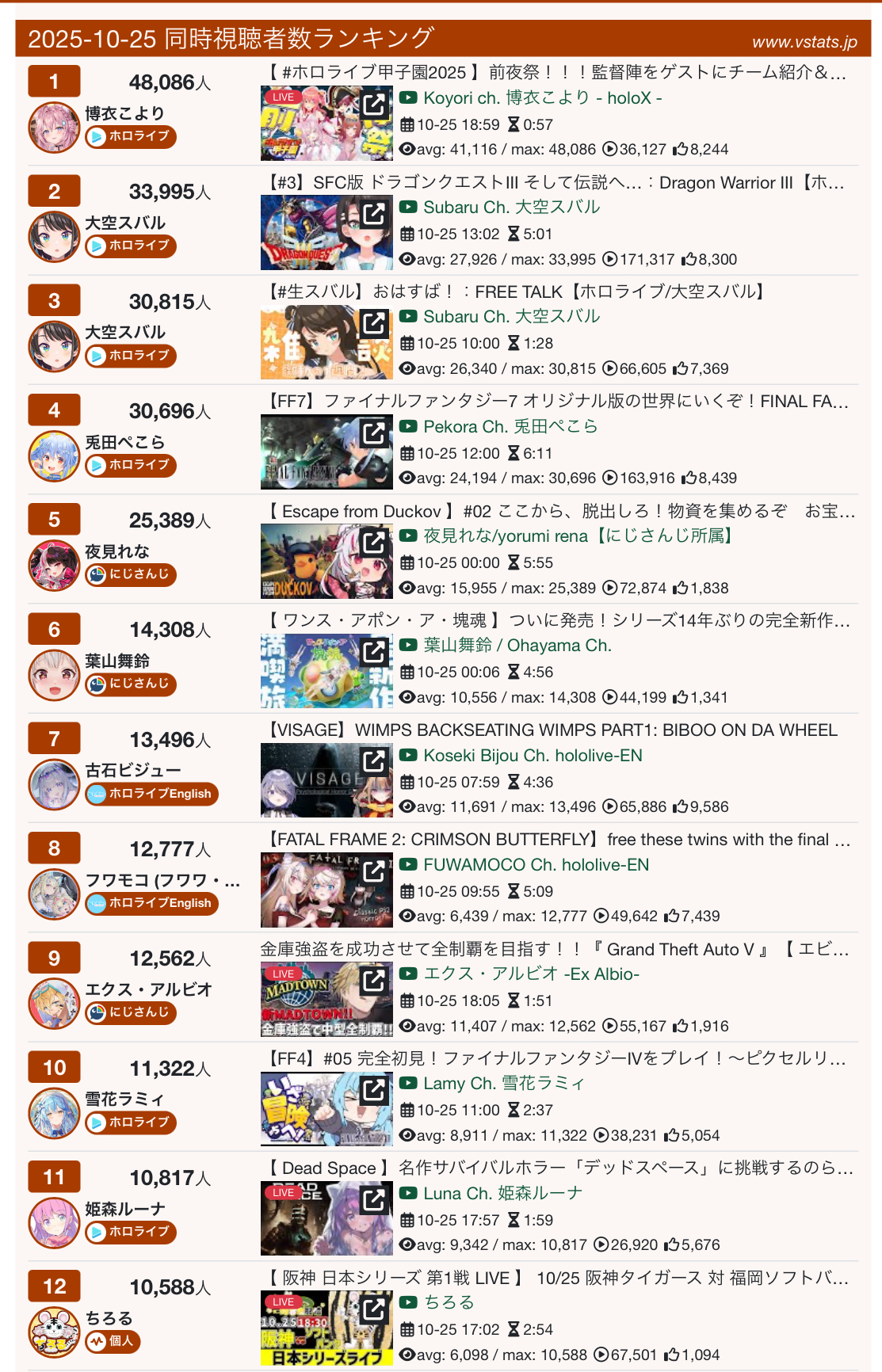 *GENERAL NUMBERFAG SITES*>https://playboard.co/en/>http://ikioi-ranking.com/>https://vrabi.net/>https://www.vstats.jp>https://live-ranking.userlocal.jp/vtuber-ranking>https://vt.poi.cat/Hololive sites>https://www.hololyzer.net/youtube/index.html>https://trackholo.live/en/>https://holo-spotify-stats.jirikunes.eu/Twitch sites>https://sullygnome.com/>https://twitchtracker.com/>https://stats.roki.sh/>https://streamscharts.com/