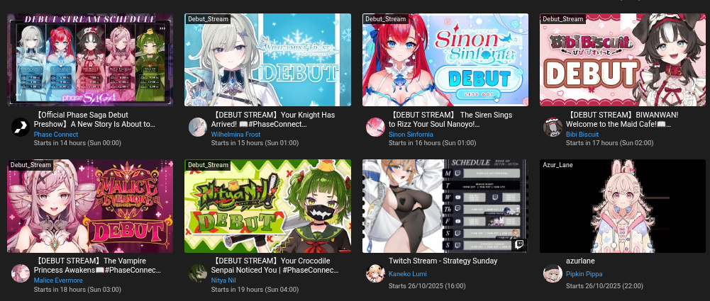▼ Phase Connect LinksOfficial Website: https://phase-connect.comOfficial Schedule: https://schedule.phase-connect.comOfficial Twitter: https://x.com/PhaseConnect | https://x.com/PhaseConnectJPOfficial Character References: https://rentry.org/pcgreferencesOfficial Twitch Archive Channels: https://rentry.org/pcgtwitcharchiveUnofficial Phase Connect Archives: https://rentry.org/pcgunofficialarchive––––––––––––––––––––––––––––––––––◆【Lia】https://x.com/rinkouashelia | https://youtube.com/RinkouAshelia | https://twitch.tv/asheliarinkou◆【Utatane Nasa】転寝ナサ (JP) https://x.com/UtataneNasa | https://youtube.com/UtataneNasa | https://twitch.tv/utatanenasa◆【Hakushika Iori】白鹿いおり (JP + EN) https://x.com/hakushikaiori | https://youtube.com/HakushikaIori | https://twitch.tv/iorihakushika◆【Fujikura Uruka】https://x.com/fujikurauruka | https://youtube.com/FujikuraUruka | https://twitch.tv/fujikurauruka◆【Shisui Michiru】紫翠みちる (JP) https://x.com/shisuimichiru | https://youtube.com/ShisuiMichiru | https://twitch.tv/michiru_shisui◆【Tenma Maemi】https://x.com/tenmamaemi | https://youtube.com/TenmaMaemi | https://twitch.tv/tenma◆【Pipkin Pippa】https://x.com/pipkinpippa | https://youtube.com/PipkinPippa | https://twitch.tv/pippa––––––––––––––––––––––––––––––––––◆【Kaneko Lumi】https://x.com/kaneko_lumi | https://youtube.com/KanekoLumi | https://twitch.tv/kanekolumi◆【Fuura Yuri】[Terminated] https://x.com/AmarisYuri | Archive: https://youtube.com/@TheNationalFuuraYuriArchive◆【Dizzy Dokuro】https://x.com/dizzydokuro | https://youtube.com/@dizzydokuro | https://twitch.tv/dizzydokuro◆【Jelly Hoshiumi】https://x.com/jellyhoshiumi | https://youtube.com/@jellyhoshiumi | https://twitch.tv/jellyhoshiumi◆【Ember Amane】https://x.com/emberamane | https://youtube.com/@EmberAmane | https://twitch.tv/emberamane◆【Clio Aite】https://x.com/ClioAite | https://youtube.com/@ClioAite | https://twitch.tv/clioaite◆【MariMari_en】https://x.com/MARIMARI_EN | https://youtube.com/@MARIMARI_EN | https://twitch.tv/marimari_en◆【Eepy Sleepy】https://x.com/EepySleepyCh | https://www.youtube.com/@EepySleepyCh | https://twitch.tv/EepySleepyCh––––––––––––––––––––––––––––––––––◆【Remilia Nephys】https://x.com/Remilia_Nephys | https://youtube.com/RemiliaNephys | https://twitch.tv/remilianephys◆【Chisaka Airi】https://x.com/ChisakaAiri | https://youtube.com/ChisakaAiri | https://twitch.tv/chisakaairi◆【Amanogawa Shiina】https://x.com/AmanogawaShiina | https://youtube.com/AmanogawaShiina | https://twitch.tv/amanogawashiina◆【Himemiya Rie】https://x.com/HimemiyaRie | https://youtube.com/HimemiyaRie | https://twitch.tv/himemiyarie◆【Erina Makina】https://x.com/ErinaMakina | https://youtube.com/ErinaMakina | https://twitch.tv/erinamakina◆【Komachi Panko】https://x.com/komachipanko | https://youtube.com/KomachiPanko | https://twitch.tv/komachipanko––––––––––––––––––––––––––––––––––◆【Runie Ruse】https://x.com/RunieRuse | https://youtube.com/@RunieRuse | https://twitch.tv/RunieRuse◆【Eimi Isami】https://x.com/eimiisami | https://youtube.com/@eimiisami | https://twitch.tv/eimiisami◆【Muu Muyu】https://x.com/Muu_Muyu | https://youtube.com/@MuuMuyu | https://twitch.tv/MuuMuyu◆【Hikanari Hina】https://x.com/HikanariHina | https://youtube.com/@HikanariHina | https://twitch.tv/HikanariHina◆【Saya Sairroxs】[Hort] https://x.com/sayasairroxs | https://youtube.com/@sayasairroxs | https://twitch.tv/sayasairroxs––––––––––––––––––––––––––––––––––◆【Kannagi Loki】巫ロキ (JP) https://x.com/kannagiloki | https://youtube.com/@kannagiloki◆【Kokoromo Memory】恋衣めもり (JP) https://x.com/kokoromomemory | https://youtube.com/@kokoromomemory_ | https://twitch.tv/kokoromomemory◆【Gram Pico】倉夢ぴこ (JP) https://x.com/grampico_ | https://youtube.com/@grampico | https://twitch.tv/grampico◆【Ayase Yuu】絢世ユウ (JP) https://x.com/ayaseyuuu | https://youtube.com/@ayaseyuu | https://twitch.tv/ayaseyuu_◆【Kaminari Clara】歌美鳴クララ (EN + JP) https://x.com/kaminariclara_ | https://youtube.com/@kaminariclara | https://twitch.tv/kaminariclara––––––––––––––––––––––––––––––––––◆【Malice Evermore】https://x.com/MaliceEvermore | https://www.youtube.com/@maliceevermore | https://www.twitch.tv/maliceevermore◆【Nitya Nil】https://x.com/Nitya_Nil | https://www.youtube.com/@Nitya_Nil | https://www.twitch.tv/nitya_nil◆【Wilhelmina Frost】https://x.com/wilhelminafr0st | https://www.youtube.com/@wilhelminafrost | https://www.twitch.tv/wilhelminafrost◆【Bibi Biscuit】https://x.com/BibiBiscuitCh | https://www.youtube.com/@bibibiscuitch | https://www.twitch.tv/bibibiscuitch◆【Anya Nyabyss】https://x.com/AnyaNyabyss | https://www.youtube.com/@AnyaNyabyss | https://www.twitch.tv/anyanyabyss◆【Sinon Sinfonia】https://x.com/SinonSinfonia | https://www.youtube.com/@SinonSinfonia | https://www.twitch.tv/sinonsinfoniaPrevious Thread: >>105879638