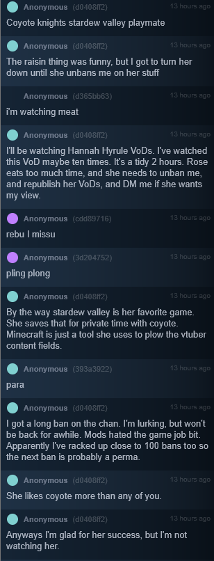 >I got a long ban on the chan. I'm lurking, but won't be back for awhile. Mods hated the game job bit. Apparently I've racked up close to 100 bans too so the next ban is probably a perma.