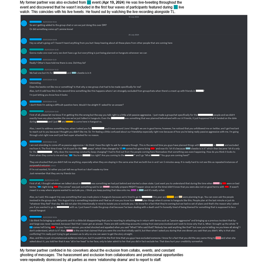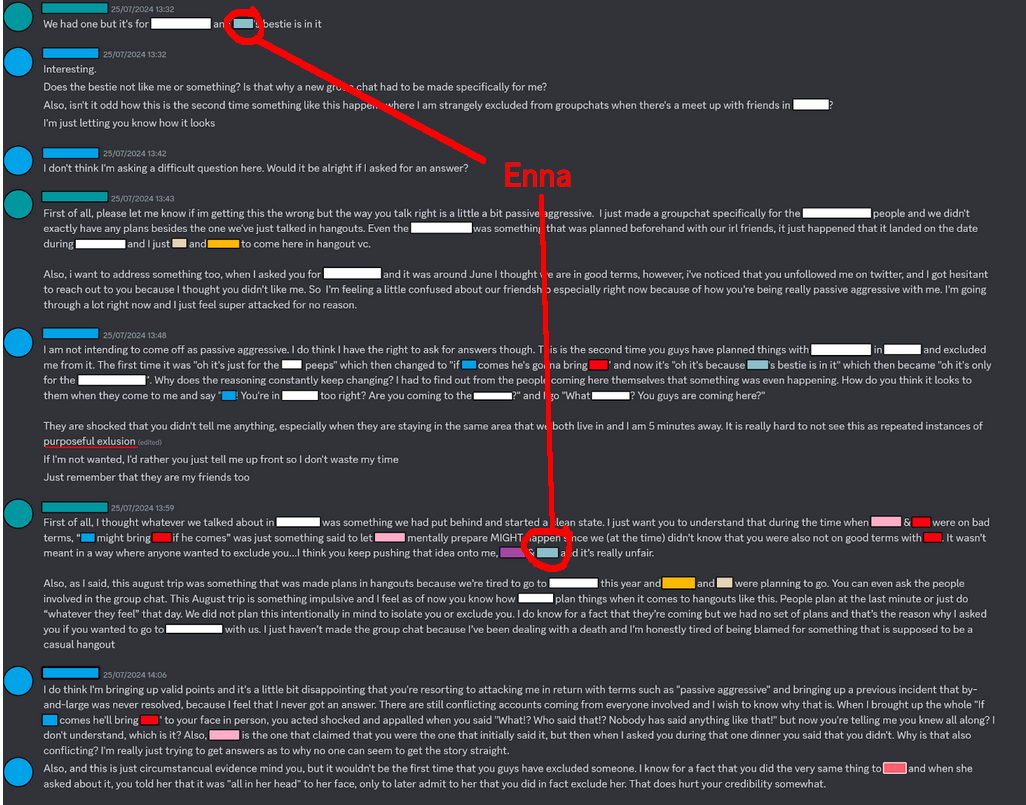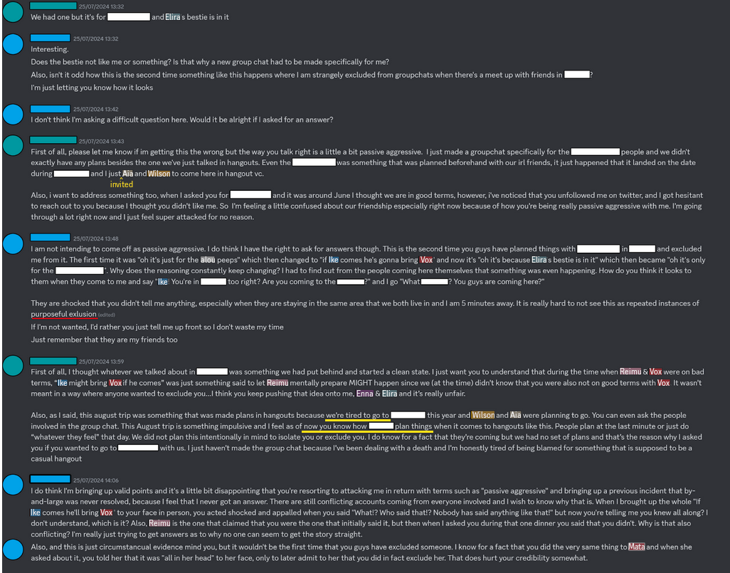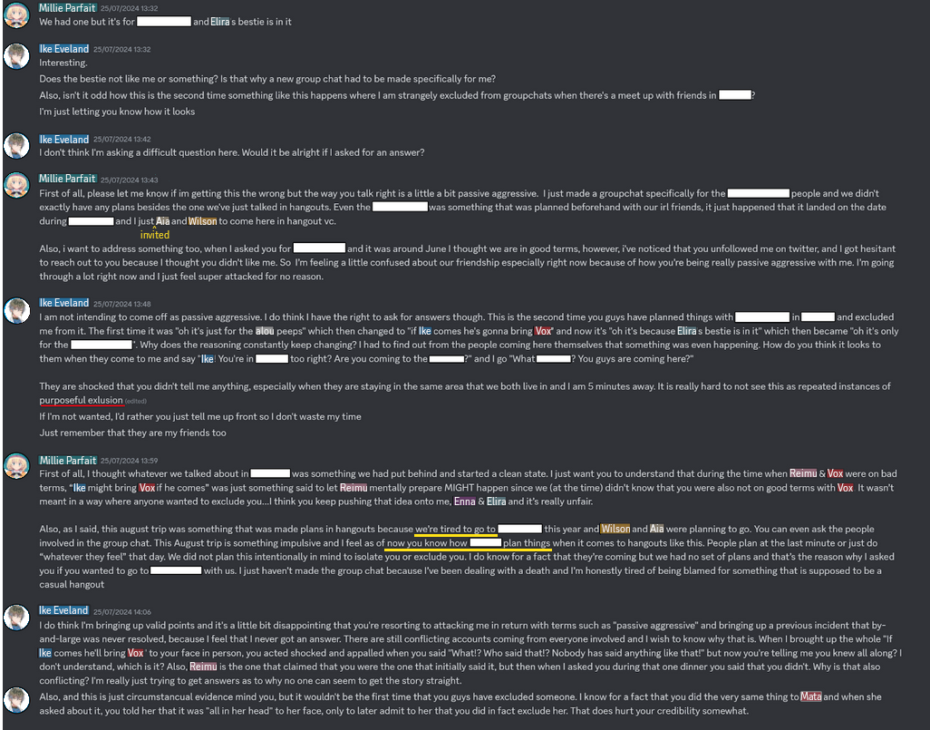 Here’s my schizo theory on why Nina ended up being the first victim of exclusion.>>Luxiem’s 2021 debut became a megahit and took the nijicommunity by storm.>>The Ethyria wave became interested, especially Reimu. She seemed to have her sights set on Vox and Ike for her personal “harem,” though her main focus was on Vox. Ike appeared to be more of a backup or rebound option for her, [which is why, after Ike rejected her, she told the other two members to exclude him.] (later of the event)>>The other Ethyria members were enthusiastic about the potential boost in popularity their wave could achieve, so their collaborations were driven by promotional goals rather than personal or romantic intentions like Reimu had in mind.>>Demonstrating her cleverness, Nina strategically made the first move by contacting the Luxiem members through Mysta. At the time, Vox and Ike were in the spotlight, while Mysta was seen as the more submissive bottom, clownish member of the group. However, this move turned out to be advantageous Mysta eventually rose to become one of Luxiem’s most popular and influential figures, second only to Vox. This allowed Nina to establish valuable connections within the Luxiem wave.>>Leveraging the connection Nina had already built through Mysta, she managed to arrange off-collabs with the Luxiem wave. This happened twice the first, called Nijieu, was uploaded on her channel, this is Fanmade [https://www.youtube.com/watch?v=TQgyX8yqQBI], while the second took place on Mysta channel. After the second collab, Mysta began to feel responsible for Nina, as it led to unexpected backlash. He became mentally distressed and overwhelmed when Nina started receiving attacks from Luxiem fans. This forced Mysta and Nina to avoid interacting online, creating distance to calm the situation. Though they remained close and continued to interact in person, they steered clear of each other online after the Luxiem off-collab incident. This shift also affected the dynamic between Mysta, Mika, Nina, and Ike, who remained close but had to adjust the way they communicated.[https://youtu.be/aK50X1klpl8?t=2860]>>My guess is that the second collab upset the rest of Ethyria because Nina brought Mika instead of her own branch mates, which ended up being the final straw..>>Naturally, Reimu wasn’t pleased that someone like Nina managed to make the first move so quickly and effectively. That’s why she told her branch mates to exclude Nina, and the two of them agreed, like obedient followers, because they were tightly bonded as cliques friends.
