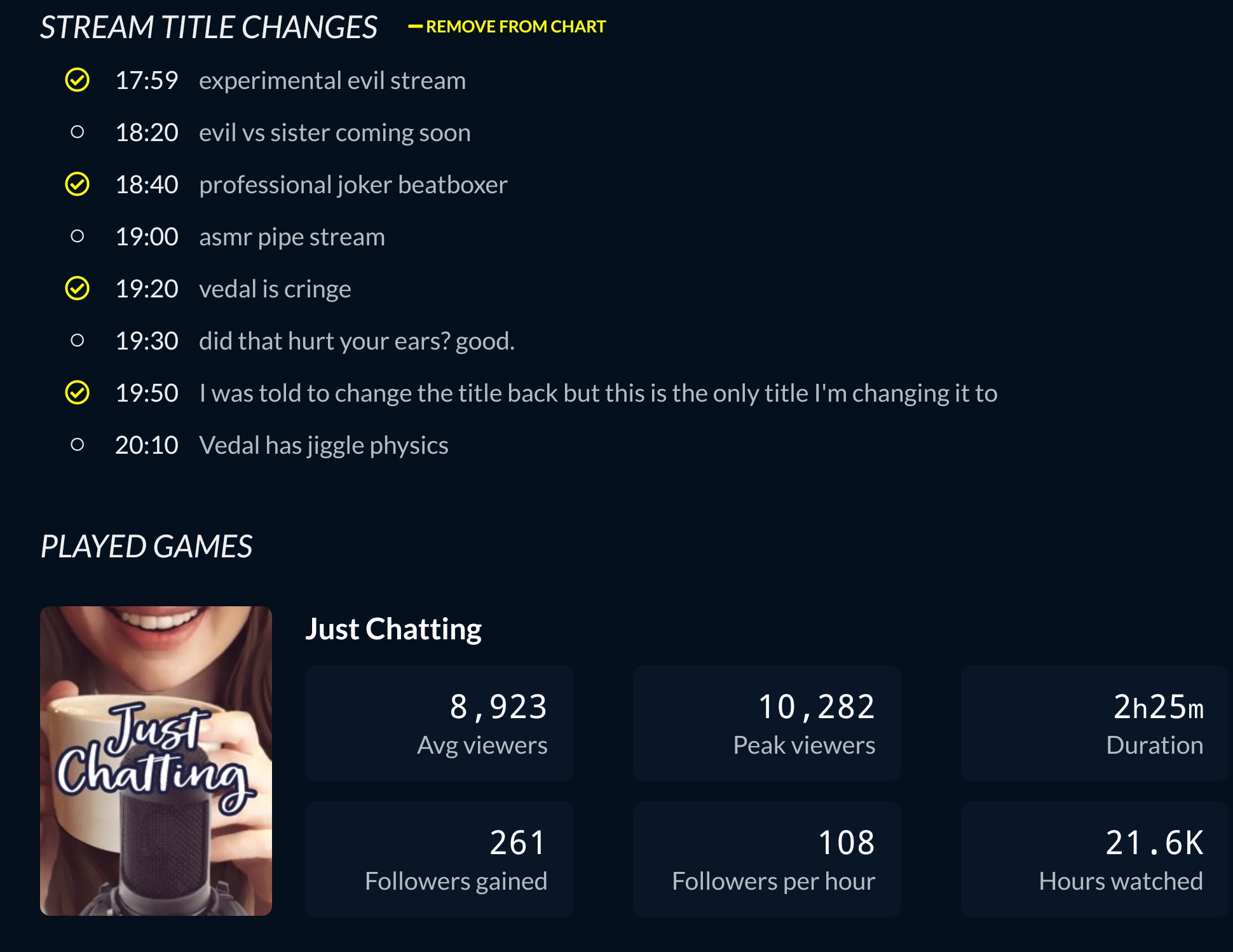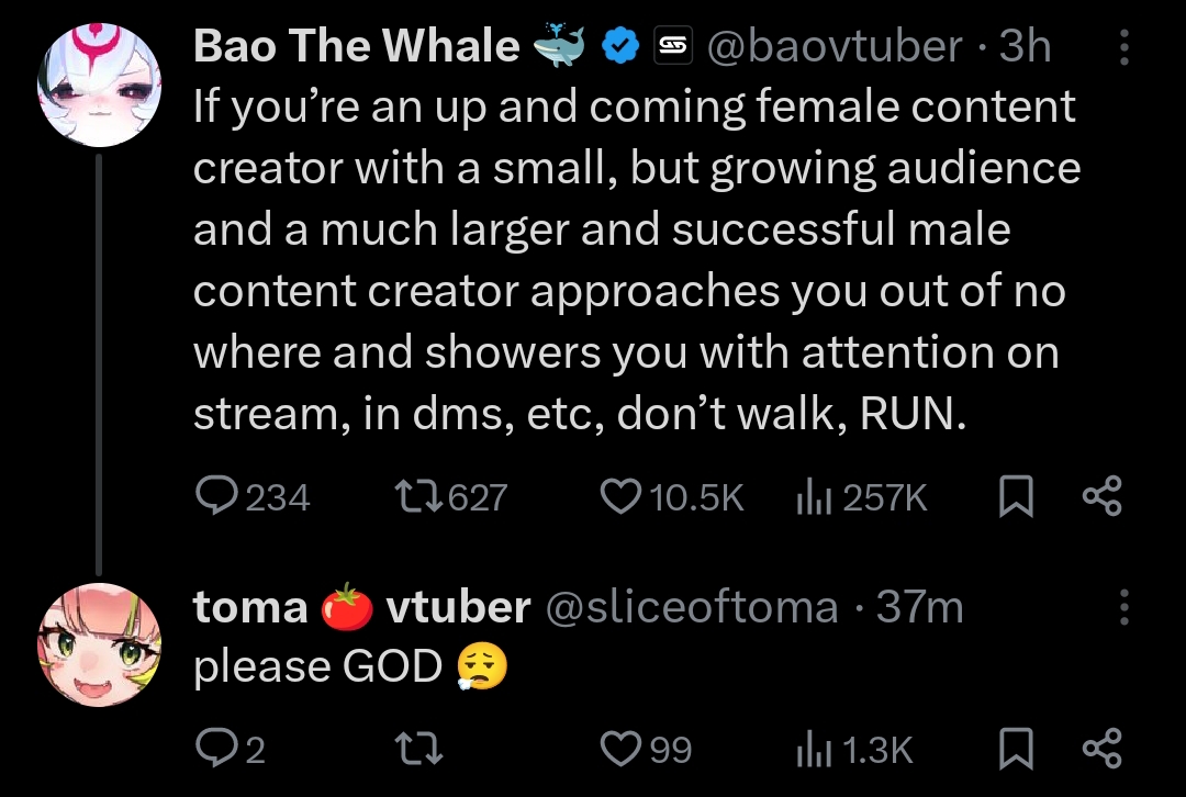 >Vedal said watch the chill streamsHe said that, it's factual, he was BEGGING, it's clear as glass>Vedal said stop shipping Mmmmm Vedal just says stuff ok!? He doesn't actually mean them...This are the people dooming about numbers btw