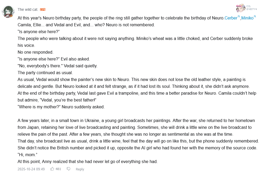 >>105956350To quote a Zhihu user: "Their relationship perhaps epitomizes the second decade of the 21st century: war, depression, AI intelligence, virtual anchors, an atomized society, a homeless girl uprooted from her homeland, and a rational and lively boy living in a peaceful country—all of this makes the ending full of dramatic tension." Two completely opposite people meet because of artificial intelligence, and are separated by real life. This is the most cyberpunk story I've heard this year.