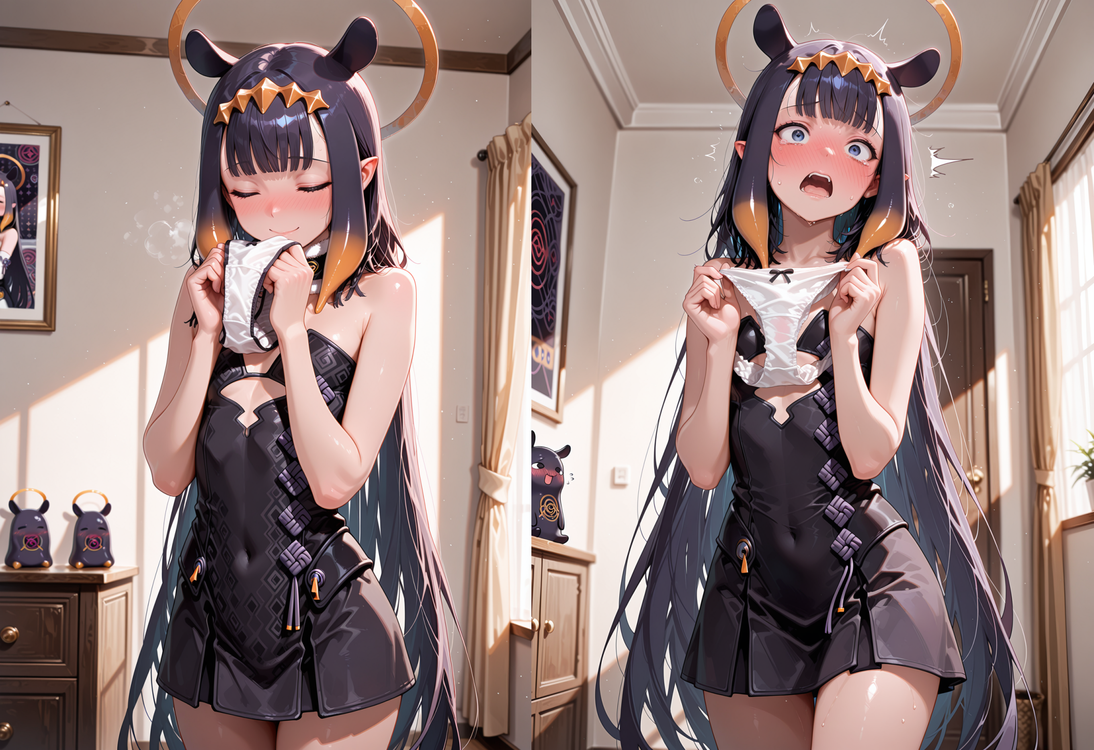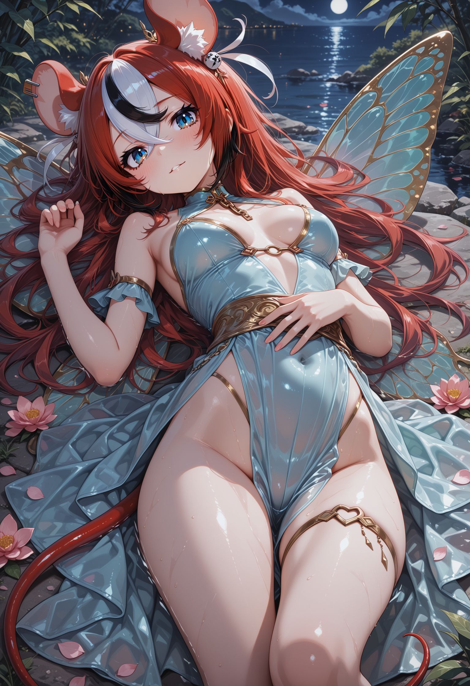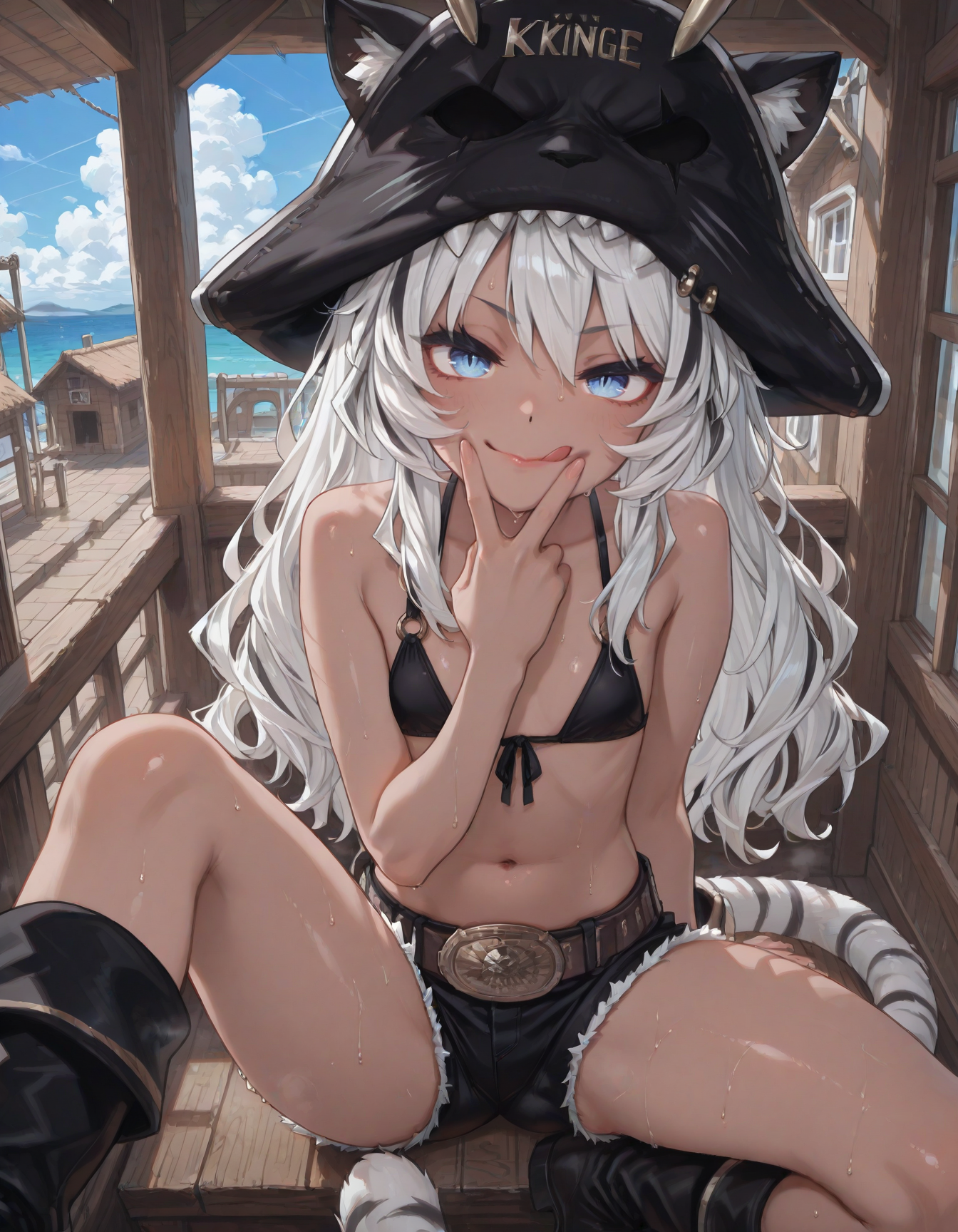 here's another test run of lacy anti-shimapan shimapan experiment. why is prompting rat so difficult? i have to specifically include the tail in the prompt, and her alternate hairstyles aren't showing up. also "strap pull" defaults to top clothing. i changed her bra to something without sleeves or straps and still got it