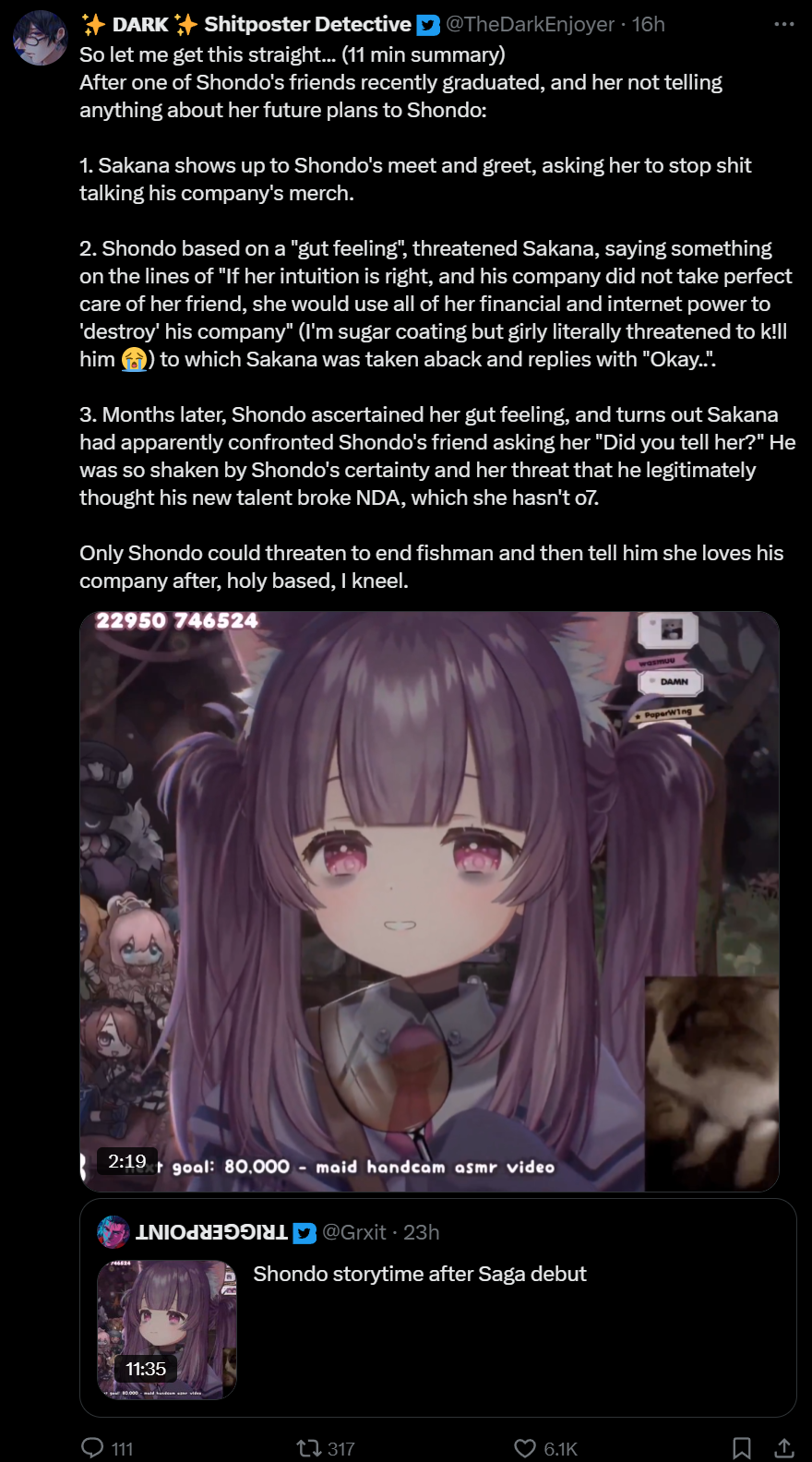 >>105980636It's funny to me that shondo is still seething that phase is turning away from right wing grifting while she debuted her shitler personality. Fucking skank, I pray every day that someone finds old chatlogs of her saying the N-word or something so she can finally get canceled.