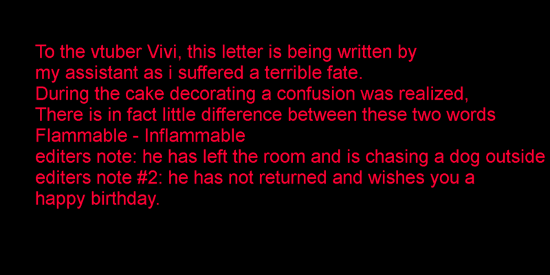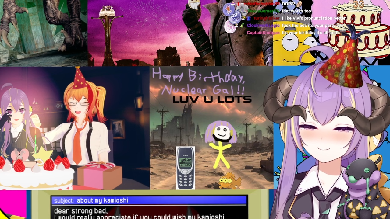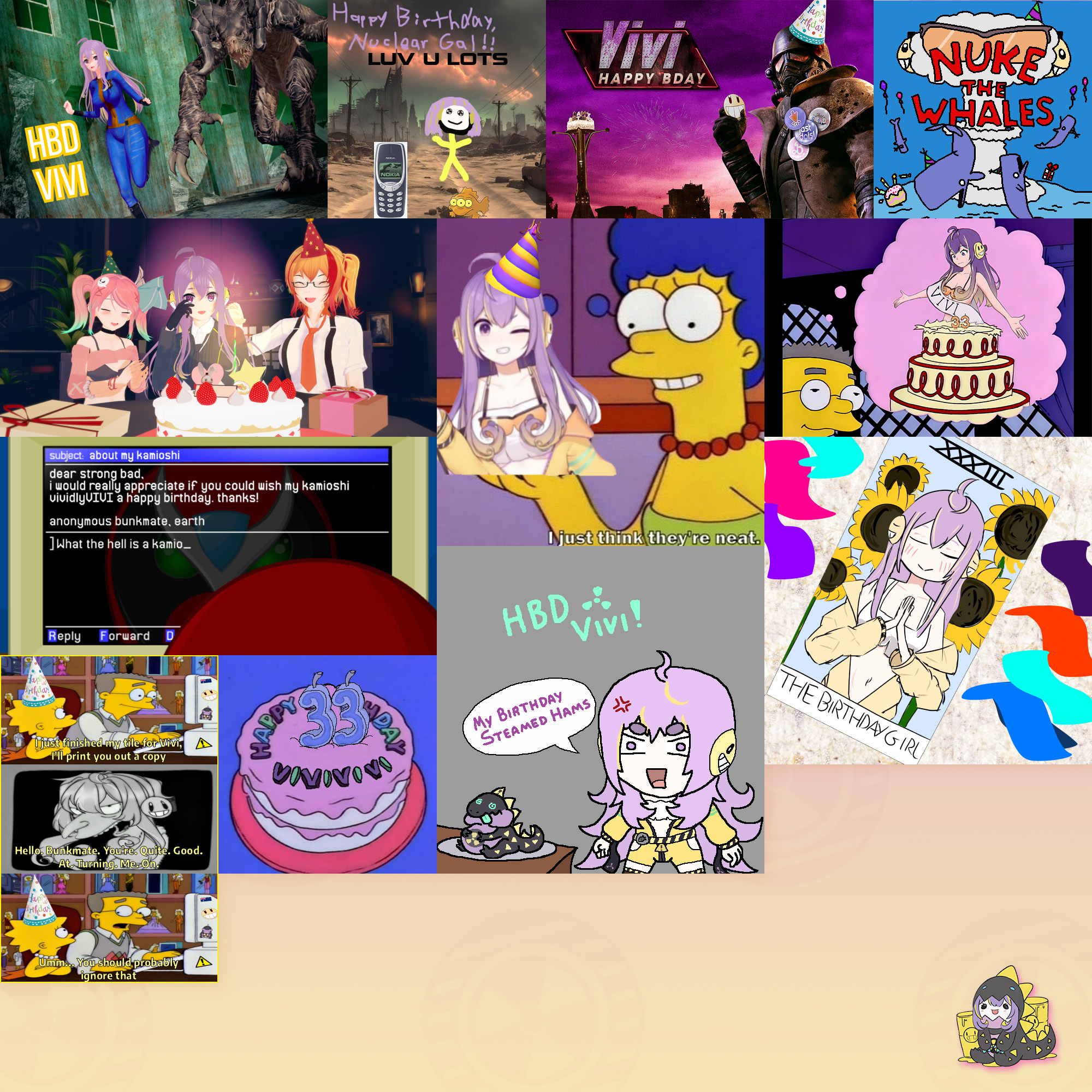 In SIXTY MINUTES Vivi will be turning 33; show your appreciation by contributing to her birthday card! Submissions must be SFW and have image dimensions that are a multiple of 200 (200x200, 400x400, 200x400, etc).Some things Vivi likes for inspiration:>The Simpsons, Homestar Runner, Fallout, Broken Sword>Visual Novels, Cozy Games>Achivement Hunting, TarotAs well as her many friend groups, such as:>Barbies (Nina, Inis, Shondo, Olivia, Tanya and Soya)>Vershion (Mako, Jets, Clio, Hanya and Yozo)>JAST idols (Reiyu, Tane, Yozo, Kumo and Ichigo)>Just Friends (Nemo, Aito, Bakiin, Shuumi, Wayshi, Pucci and Pearl)Model references: https://mega.nz/folder/oz0GlT5Y#HGPq78f8S7mEgGTTGMQ4tgThe deadline for the card is midnight October 28th in Australian Central Daylight Time, which is 9:30 AM October 27th in EDT. Make sure you get your tiles in before then!