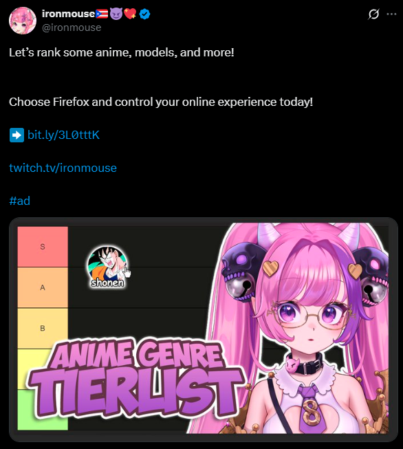 >>106010555If Mouse does drop her plans she really doesn't give a shit about her chat.We get solo tier lists but only because of a sponsor and she drops the things she said she would do to spend time with her BF.