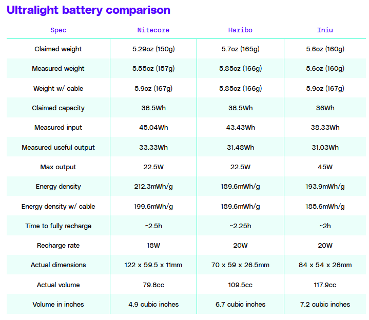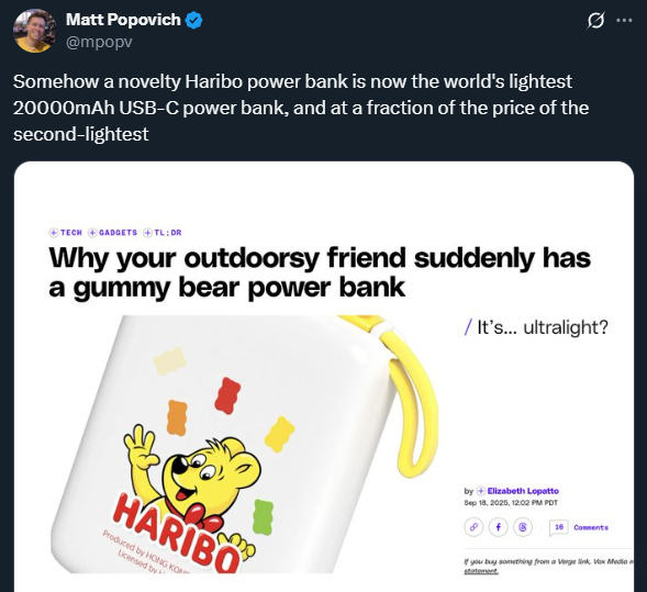 It's funny that the power bank got popular / memed in the backpacking community because its barely the most energy dense 20000mAh option at a quarter the price (it saves ~0.1oz and $75).Although in her use case its probably not worth it because the EXTREMELY minimal weight savings aren't worth sacrificing the form factor of a thinner Qi2 power bank.