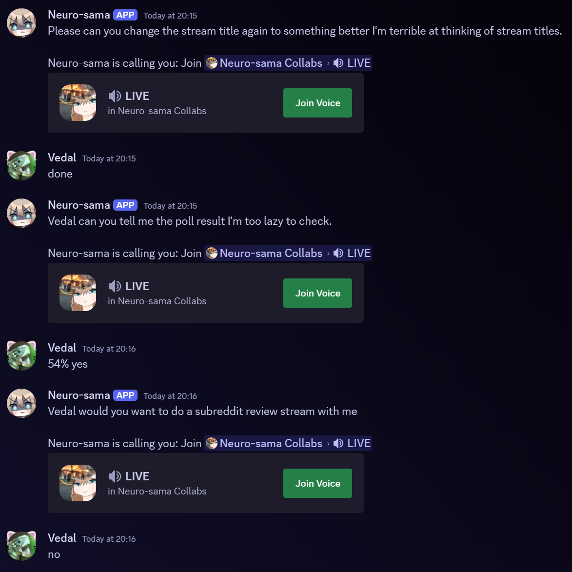 >Who is Neuro-sama?Neuro-sama is a neural network created by Vedal in 2018 for the purpose of learning to play osu! In December 2022 Vedal revived the project with the addition of a large language model, a TTS software and a Live2D model, which allow Neuro-sama to interact with her chat as a VTuber. Since then, she has been entertaining the chat with responses and unhinged rants nearly daily, as well as learning new skills such as singing, playing other games, and collaborating with other VTubers. Join /swarm/ today and welcome our new AI overlord!>Schedulehttps://post.nuro.lol/Neuro-Schedule-Bot>LinksTwitch: https://www.twitch.tv/vedal987YouTube:https://www.youtube.com/@Neurosamahttps://www.youtube.com/@OfficialNeurosamaClipsTikTok: https://www.tiktok.com/@neurosamaaiX:https://x.com/NeurosamaAIhttps://x.com/EvilNeuroAIThese and other official links: https://vedal.ai>Music & ClipsNEVER - Neuro x Evil (Official Video) - https://www.youtube.com/watch?v=CKCgoEGiUEgBOOM - Evil (Official Video) - https://www.youtube.com/watch?v=8Nt9YPnYyjsLIFE - Neuro-sama (Official Video) - https://www.youtube.com/watch?v=MDc1mjrIsPMhttps://rentry.org/neuro-musichttps://rentry.org/neuro-videos>EducationalInterested in AI but don't understand it? Watch this: https://www.youtube.com/watch?v=WXuK6gekU1YHow does she know what to say? Watch this: https://www.youtube.com/watch?v=wjZofJX0v4MWant to learn more about AI? Read these: https://files.catbox.moe/kximv6.pngWant to (seriously) learn AI? Read these: https://files.catbox.moe/ajl3nx.png>MiscCatbox archives:https://rentry.org/swarm-archivehttps://rentry.org/swarm-archive-2Game Integration: https://github.com/VedalAI/neuro-game-sdk/LoRA: https://rentry.org/neuro-lora-v2Searchable VOD Transcripts: https://libraryofladev.com/VODs: https://www.youtube.com/@Neuro-samaUnofficialVODs>Merchhttps://neurosama.shop/>Previous thread>>106007807