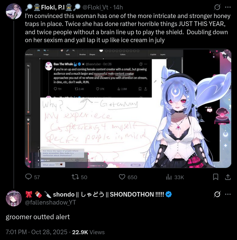>>106032339>Was Bao calling someone out specifically?She said she was, but that she couldn't overtly name them because she'd been legally threatened by whoever it was, so she just kept heavily implying whoever it was last night. I don't know enough about any of this shit to have figured out who she was talking about, though.