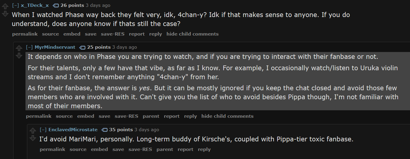 I'm surprised rebbit even talks about vtubers these days. I remember in the past it was such a dead place that the top trending things would be>corpo sells merchandiseAnd>hey redditors my name is kipper kamikaze and my twitch debut is in 2 weeks!Pippa even made her own called "r/chuubas" or something that was (at the time) significantly more active.I just don't associate their culture getting along with vtubers unless it's dramafagging on LSF about someone big like Sinder or Vei.