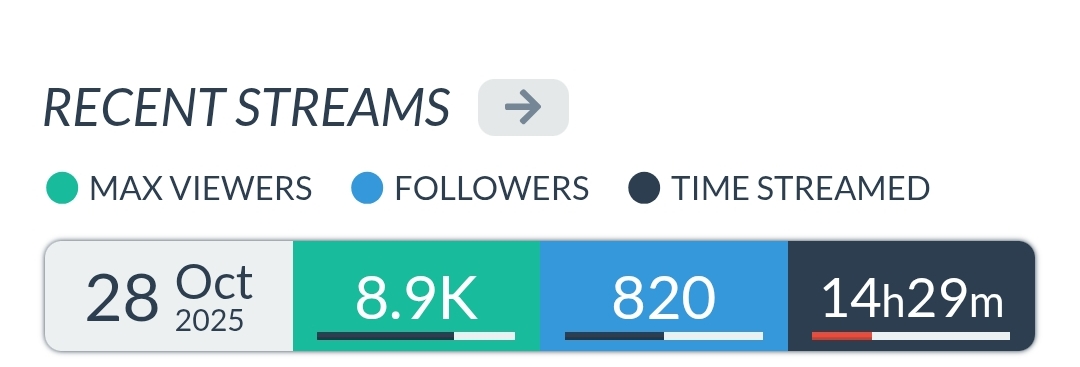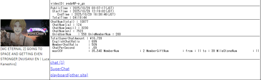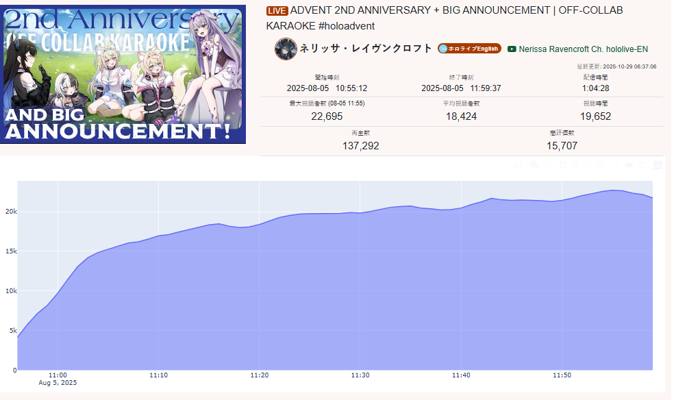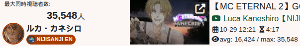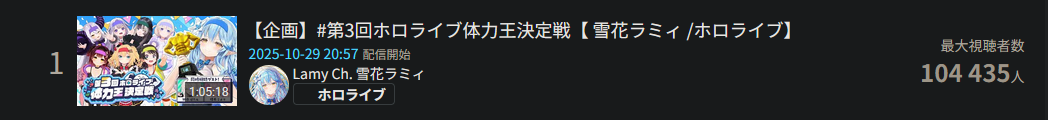 >>106068949OCT 2025 SILVER>1) 45,197: Miko (hololive) Hololive Koushien 2025 Sakurasaki HS Year 2>2) 30,541: Lauren (nijisanji) GTA5 MADTOWN>3) 47,275: Koyori (hololive) Hololive Koushien 2025 BBQ>4) 49,718: Subaru (hololive) Naruto Shippuden: Ultimate Ninja Storm 4 finale>5) 59,159: Ren Kisaragi (VSPO) VSPO pop quiz>6) 28,030: Miko (hololive) Oshaberi king>7) 28,578: Ririka (hololive) Hololive Koushien 2025 GENKAIJO HS Year 2>8) 45,257: Miko (Hololive)>9) 32,991: Gwelu (Nijisanji)>10) 38,032: Lauren (Nijisanji)>11) 45,458: Miko (Hololive)>12) 29,548: Lauren (Nijisanji)>13) 47,563: Kuzuha (Nijisanji)>14) 37,704: Miko (Hololive)>15) 41,741: Miko (Hololive)>16) 43,590: Chiroru (Indie) >17) 36,226: Pekora (Hololive)>18) 38,634: Miko (Hololive) >19) 46,683: Miko (Hololive)>20) 43,445: Kuzuha (Nijisanji) >21) 35,707: Calliope (Hololive)>22) 48,055: Nijisanji (Nijisanji)>23) 32,188: Calliope (Hololive)>24) 61,039: Calliope (Hololive)>25) 34,081: Subaru (Hololive)>26) 113,182: Nijisanji (Nijisanji)>27) 50,592: Lauren (Nijisanji)> PER COMPANY17x: hololive8x: nijisanji1x: VSPO1x: Indie> PER STREAMER8x: Miko3x: Calliope, Nijisanji2x: Kuzuha, Subaru1x: Lauren, Koyori, Ren Kisaragi, Ririka, Gwelu, Lauren, Chiroru, Pekora