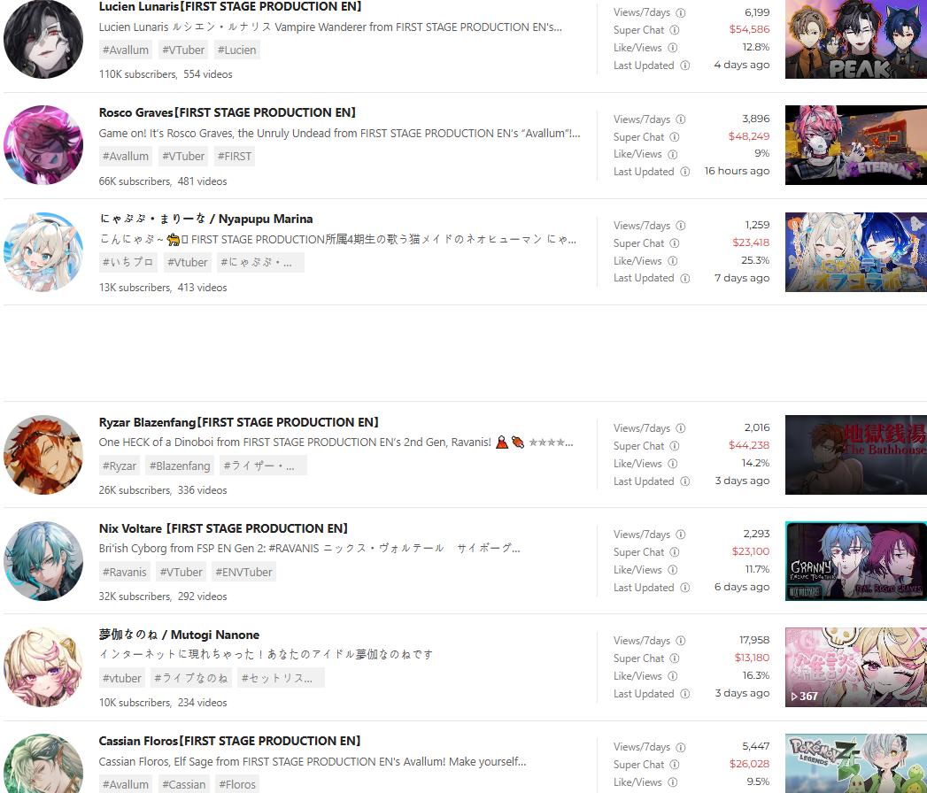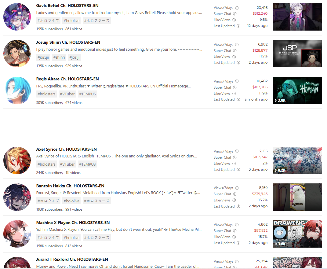 *GENERAL NUMBERFAG SITES*>https://playboard.co/en/>http://ikioi-ranking.com/>https://vrabi.net/>https://www.vstats.jp>https://live-ranking.userlocal.jp/vtuber-ranking>https://vt.poi.cat/Hololive sites>https://www.hololyzer.net/youtube/index.html>https://trackholo.live/en/>https://holo-spotify-stats.jirikunes.eu/Twitch sites>https://sullygnome.com/>https://twitchtracker.com/>https://stats.roki.sh/>https://streamscharts.com/