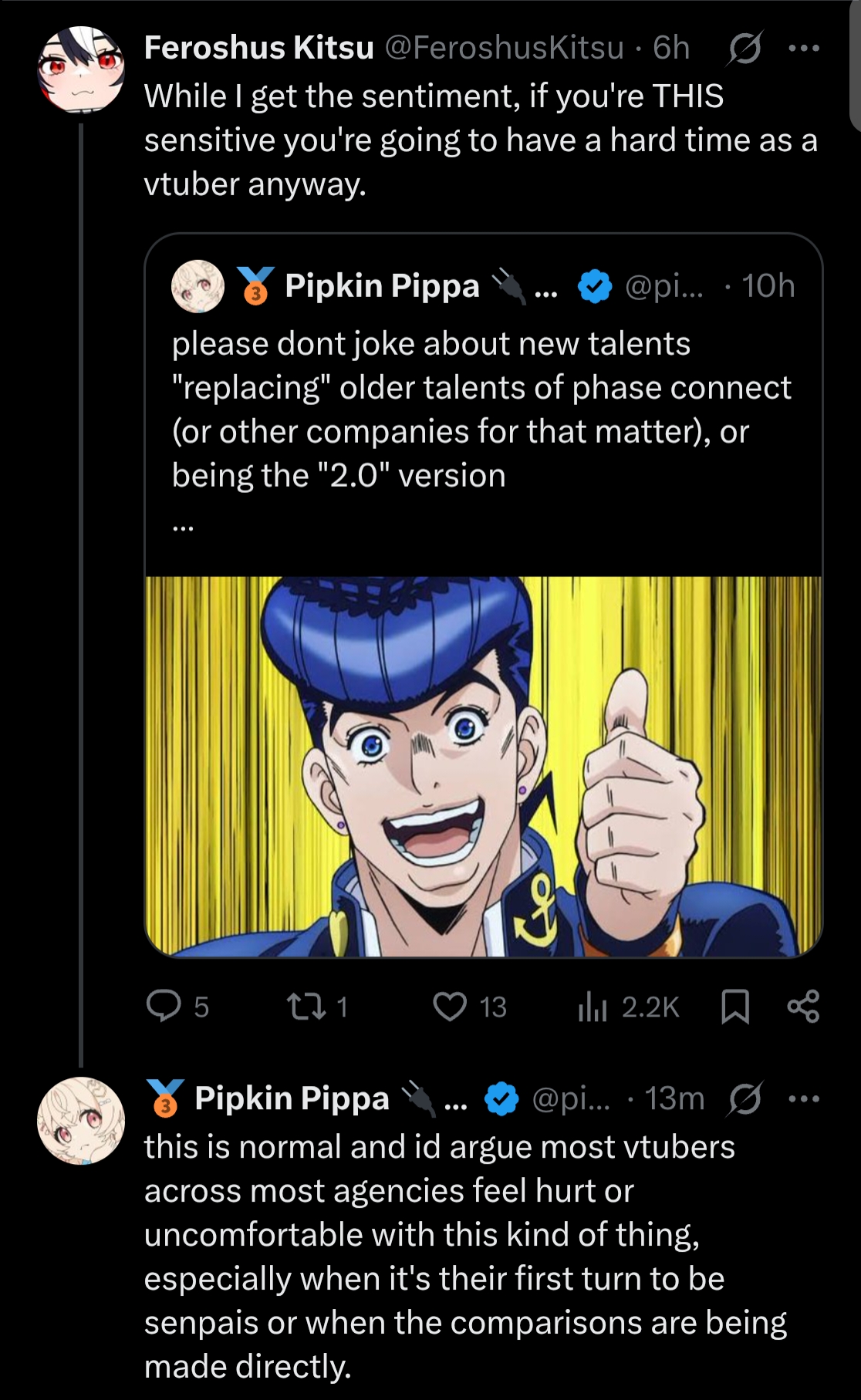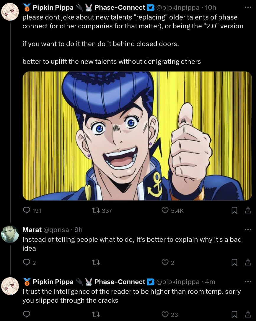 >>106078974I agree, it's a shame Pippa doesn't collab or talk with her anymore but I guess failuremaxxing and savior-baiting regulars for dear life is better than networking and giving people a fair shot. Wouldn't want Sleepy to become oldPippa 2.0