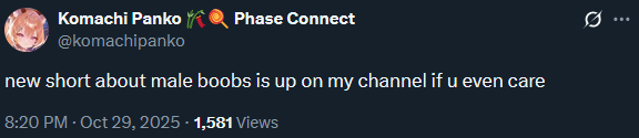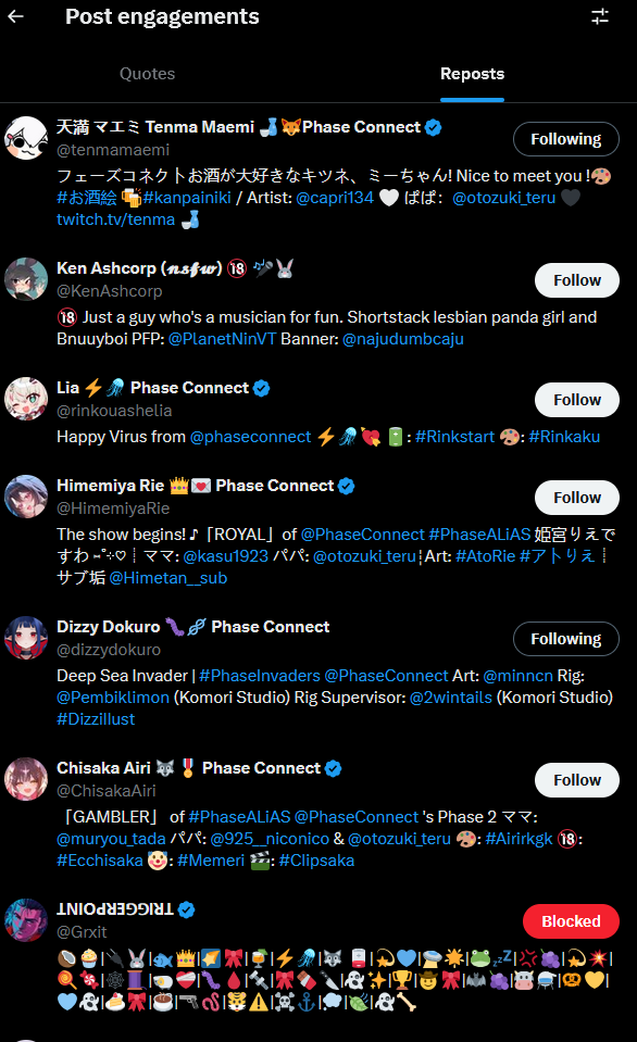 ▼ Phase Connect LinksOfficial Website: https://phase-connect.comOfficial Schedule: https://schedule.phase-connect.comOfficial Twitter: https://x.com/PhaseConnect | https://x.com/PhaseConnectJPOfficial Character References: https://rentry.org/pcgreferencesOfficial Twitch Archive Channels: https://rentry.org/pcgtwitcharchiveUnofficial Phase Connect Archives: https://rentry.org/pcgunofficialarchive––––––––––––––––––––––––––––––––––◆【Lia】https://x.com/rinkouashelia | https://youtube.com/RinkouAshelia | https://twitch.tv/asheliarinkou◆【Utatane Nasa】転寝ナサ (JP) https://x.com/UtataneNasa | https://youtube.com/UtataneNasa | https://twitch.tv/utatanenasa◆【Hakushika Iori】白鹿いおり (JP + EN) https://x.com/hakushikaiori | https://youtube.com/HakushikaIori | https://twitch.tv/iorihakushika◆【Fujikura Uruka】https://x.com/fujikurauruka | https://youtube.com/FujikuraUruka | https://twitch.tv/fujikurauruka◆【Shisui Michiru】紫翠みちる (JP) https://x.com/shisuimichiru | https://youtube.com/ShisuiMichiru | https://twitch.tv/michiru_shisui◆【Tenma Maemi】https://x.com/tenmamaemi | https://youtube.com/TenmaMaemi | https://twitch.tv/tenma◆【Pipkin Pippa】https://x.com/pipkinpippa | https://youtube.com/PipkinPippa | https://twitch.tv/pippa––––––––––––––––––––––––––––––––––◆【Kaneko Lumi】https://x.com/kaneko_lumi | https://youtube.com/KanekoLumi | https://twitch.tv/kanekolumi◆【Fuura Yuri】[Terminated] https://x.com/AmarisYuri | Archive: https://youtube.com/@TheNationalFuuraYuriArchive◆【Dizzy Dokuro】https://x.com/dizzydokuro | https://youtube.com/@dizzydokuro | https://twitch.tv/dizzydokuro◆【Jelly Hoshiumi】https://x.com/jellyhoshiumi | https://youtube.com/@jellyhoshiumi | https://twitch.tv/jellyhoshiumi◆【Ember Amane】https://x.com/emberamane | https://youtube.com/@EmberAmane | https://twitch.tv/emberamane◆【Clio Aite】https://x.com/ClioAite | https://youtube.com/@ClioAite | https://twitch.tv/clioaite◆【MariMari_EN】https://x.com/MARIMARI_EN | https://youtube.com/@MARIMARI_EN | https://twitch.tv/marimari_en◆【Eepy Sleepy】https://x.com/EepySleepyCh | https://www.youtube.com/@EepySleepyCh | https://twitch.tv/EepySleepyCh––––––––––––––––––––––––––––––––––◆【Remilia Nephys】https://x.com/Remilia_Nephys | https://youtube.com/RemiliaNephys | https://twitch.tv/remilianephys◆【Chisaka Airi】https://x.com/ChisakaAiri | https://youtube.com/ChisakaAiri | https://twitch.tv/chisakaairi◆【Amanogawa Shiina】https://x.com/AmanogawaShiina | https://youtube.com/AmanogawaShiina | https://twitch.tv/amanogawashiina◆【Himemiya Rie】https://x.com/HimemiyaRie | https://youtube.com/HimemiyaRie | https://twitch.tv/himemiyarie◆【Erina Makina】https://x.com/ErinaMakina | https://youtube.com/ErinaMakina | https://twitch.tv/erinamakina◆【Komachi Panko】https://x.com/komachipanko | https://youtube.com/KomachiPanko | https://twitch.tv/komachipanko––––––––––––––––––––––––––––––––––◆【Runie Ruse】https://x.com/RunieRuse | https://youtube.com/@RunieRuse | https://twitch.tv/RunieRuse◆【Eimi Isami】https://x.com/eimiisami | https://youtube.com/@eimiisami | https://twitch.tv/eimiisami◆【Muu Muyu】https://x.com/Muu_Muyu | https://youtube.com/@MuuMuyu | https://twitch.tv/MuuMuyu◆【Hikanari Hina】https://x.com/HikanariHina | https://youtube.com/@HikanariHina | https://twitch.tv/HikanariHina◆【Saya Sairroxs】[Hort] https://x.com/sayasairroxs | https://youtube.com/@sayasairroxs | https://twitch.tv/sayasairroxs––––––––––––––––––––––––––––––––––◆【Kannagi Loki】巫ロキ (JP) https://x.com/kannagiloki | https://youtube.com/@kannagiloki◆【Kokoromo Memory】恋衣めもり (JP) https://x.com/kokoromomemory | https://youtube.com/@kokoromomemory_ | https://twitch.tv/kokoromomemory◆【Gram Pico】倉夢ぴこ (JP) https://x.com/grampico_ | https://youtube.com/@grampico | https://twitch.tv/grampico◆【Ayase Yuu】絢世ユウ (JP) https://x.com/ayaseyuuu | https://youtube.com/@ayaseyuu | https://twitch.tv/ayaseyuu_◆【Kaminari Clara】歌美鳴クララ (EN + JP) https://x.com/kaminariclara_ | https://youtube.com/@kaminariclara | https://twitch.tv/kaminariclara––––––––––––––––––––––––––––––––––◆【Bibi Biscuit】https://x.com/BibiBiscuitCh | https://www.youtube.com/@bibibiscuitch | https://www.twitch.tv/bibibiscuitch◆【Sinon Sinfonia】https://x.com/SinonSinfonia | https://www.youtube.com/@SinonSinfonia | https://www.twitch.tv/sinonsinfonia◆【Wilhelmina Frost】https://x.com/wilhelminafr0st | https://www.youtube.com/@wilhelminafrost | https://www.twitch.tv/wilhelminafrost◆【Anya Nyabyss】https://x.com/AnyaNyabyss | https://www.youtube.com/@AnyaNyabyss | https://www.twitch.tv/anyanyabyss◆【Malice Evermore】https://x.com/MaliceEvermore | https://www.youtube.com/@maliceevermore | https://www.twitch.tv/maliceevermore◆【Nitya Nil】https://x.com/Nitya_Nil | https://www.youtube.com/@Nitya_Nil | https://www.twitch.tv/nitya_nilPrevious Thread: >>106071371