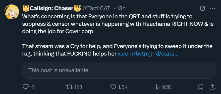 Haachama hasn't tweeted in more than 24 hours, nobody has even talked about the incident, nothing from cover yet. Anons....I'm scared.