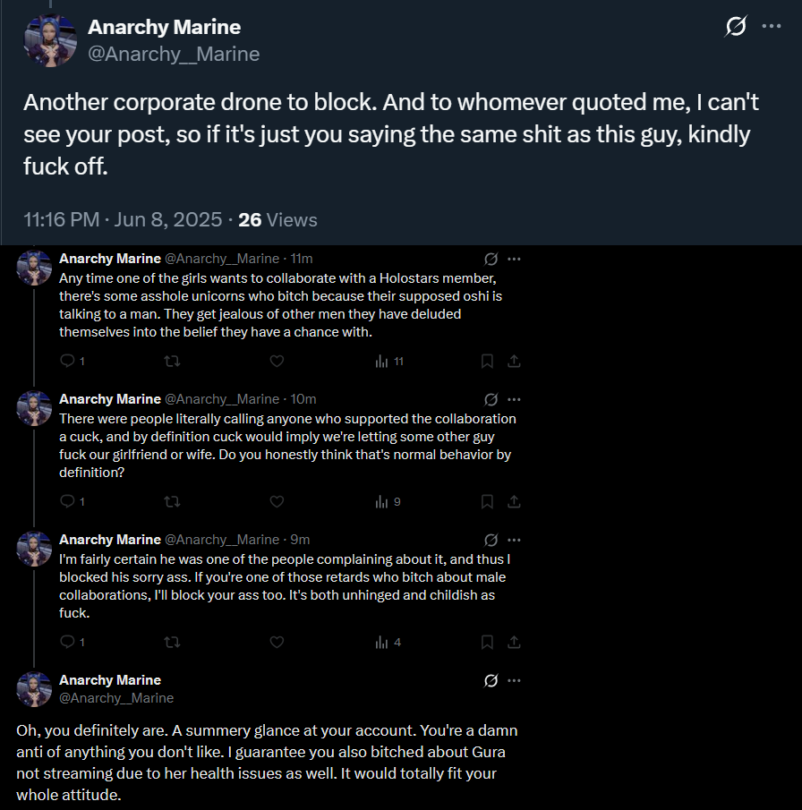 >>106087631I really lost interest in Nerissa when she called herself a side character. I don't know why, it just really annoyed me that a member of Hololive would say that. I don't hate her or anything but I'm not going to spend my time watching her outside of collabs.