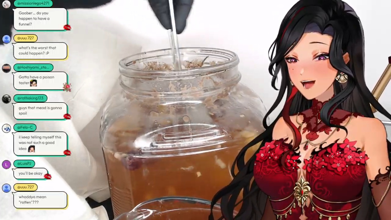 Scarle made "mead" but it's got all kinds of weird shit floating in it. She's going to drink it anyway. I miss KingCobraJFS already.
