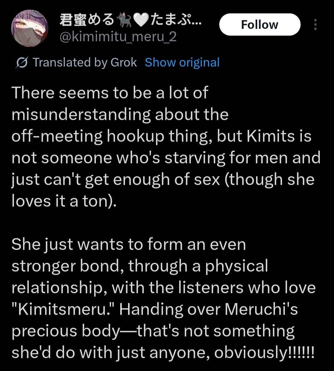 I am describing a process that I am aware of because you asked and I am decent at self-meta. none of it is fake. I didnt come here trying to groom anyone and I dont think I am, I just really enjoy my oshi. But I do know how this works well enough to tell you that you do not initiate contact. you make her WANT to