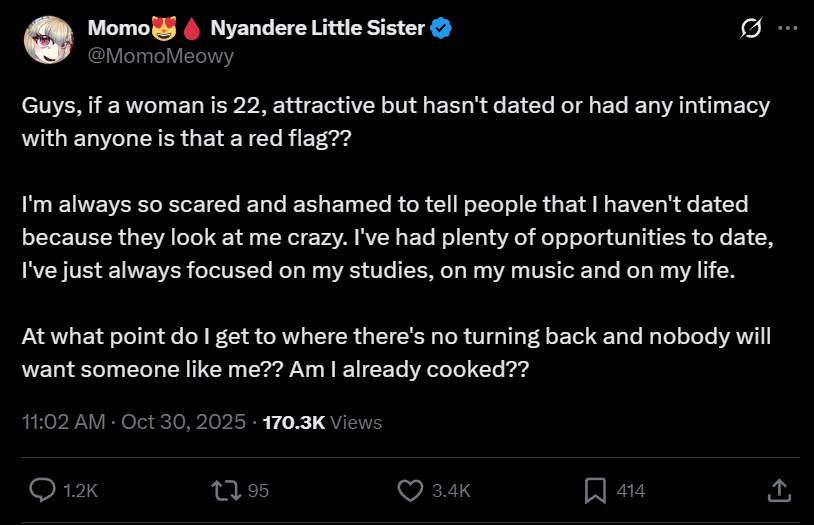 Very true, dating vtubers is extremely hard because of that factor. You basically have to be a creepy stalker just to have even a 10% chance at getting a date. I’m sure that messes with your mind.