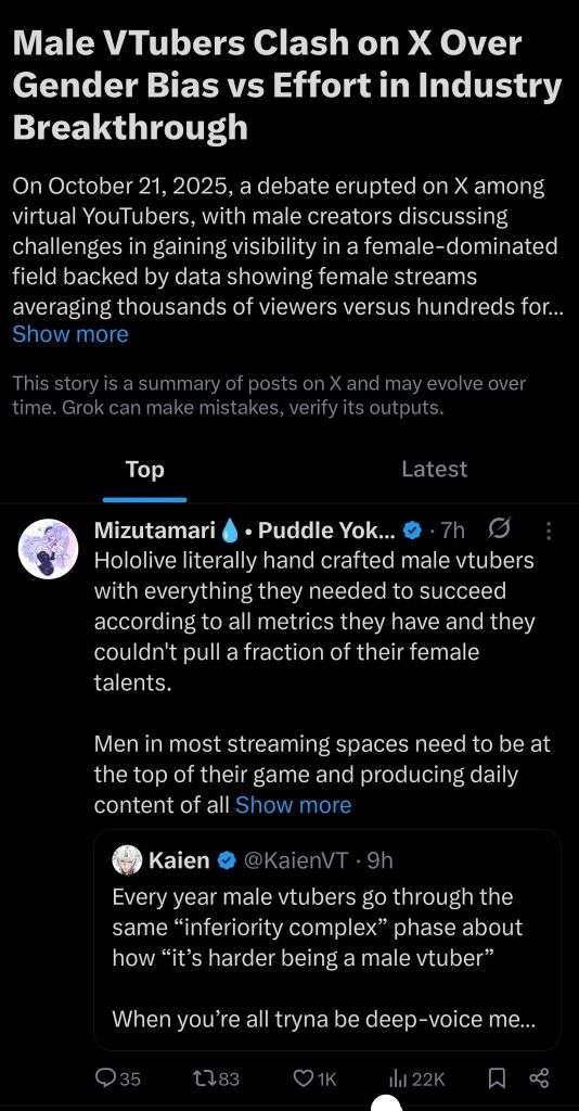 >>106121365Men are not standing up for themselves.1view male vtubers are mad and throwing shit at Bao fans, who fire back. Then pickme 2view female vtubers joined the fray.Us normal men are just watching this bizarre shit flinging.