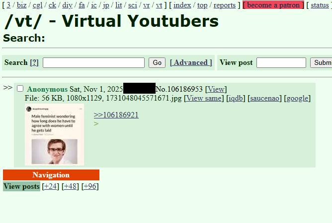 >>106186567Manosphere raiders took exception to Shondo shitting on male vtubers/"managers"/whatever this time for some reason. Unrelatedly, Shondo had one of her regularly scheduled funhouse moments which was potentially triggered by this, but let's be honest it's Shondo so she was going to have one of these episodes for some other reason around this time of year anyway.The raiders are still continuing to shit up the board with bait threads defending male vtubers while failing to understand basic /vt/ termionlogy, using reddit spacing, and worst of all defending male vtubers.Needless to say, if any of these faggots watched one they'd change their tune, but surprise surprise they've never watched a vtuber stream in their entire lives.