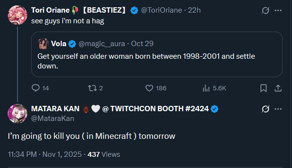 Beri and Pia are LIVE! And are playing Minecraft together in CritterSMP. Good server. Tori Mata and Nova are involved in that server too. Mouse is also LIVE! And is yapping. Simple as. Henya is also LVIE! And is playing some more Luigi's Mansion even though Halloween was yesterday. That's all for now so pick a stream and keep things comfy and civil by ignoring and especially reporting bait, and being excellent to each other.