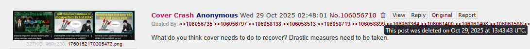 Wow they weren't kidding about the phasejannies, I made what I thought was a mild funny joke at phase's expense, unfortunately nobody else found it funny and the thread was ignored for hours, only for a janitor to find the thread untouched at page 9, get offended, and delete it anyway. These are some thin skinned fucking jannies.https://archive.palanq.win/vt/thread/106217507/Karma will come for them. You can protect phase here, but you can't protect them everywhere.