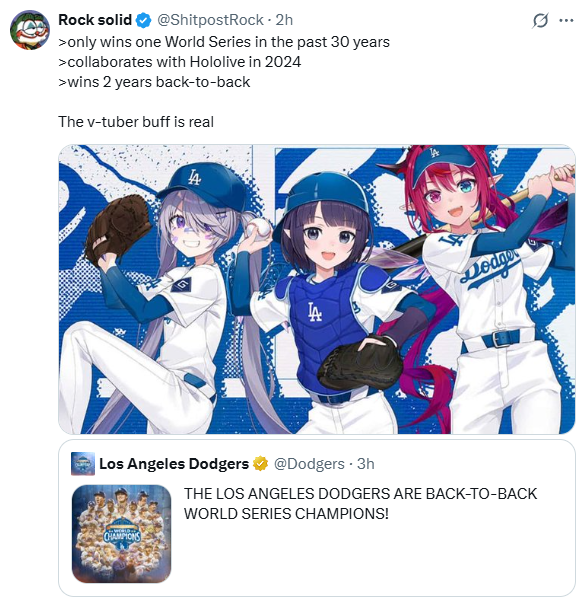 >>106228860What are the chances Hololive is solidified as the good luck charm for Dodger fans ?