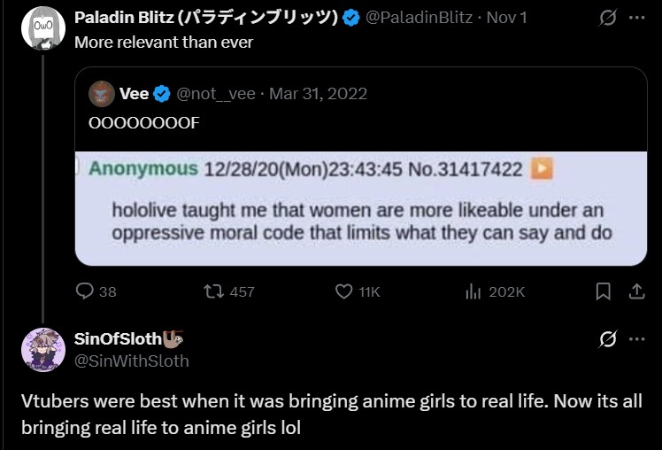 >>106232990Nijiniggers getting a taste of aligning with vbuta antis