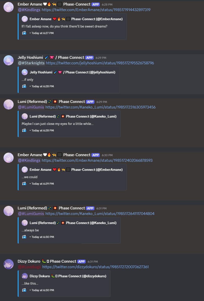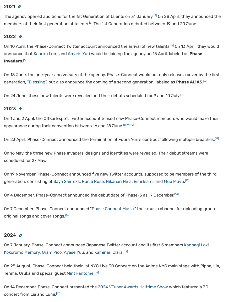 ▼ Phase Connect LinksOfficial Website: https://phase-connect.comOfficial Schedule: https://schedule.phase-connect.comOfficial Twitter: https://x.com/PhaseConnect | https://x.com/PhaseConnectJPOfficial Character References: https://rentry.org/pcgreferencesOfficial Twitch Archive Channels: https://rentry.org/pcgtwitcharchiveUnofficial Phase Connect Archives: https://rentry.org/pcgunofficialarchive––––––––––––––––––––––––––––––––––◆【Lia】https://x.com/rinkouashelia | https://youtube.com/RinkouAshelia | https://twitch.tv/asheliarinkou◆【Utatane Nasa】転寝ナサ (JP) https://x.com/UtataneNasa | https://youtube.com/UtataneNasa | https://twitch.tv/utatanenasa◆【Hakushika Iori】白鹿いおり (JP + EN) https://x.com/hakushikaiori | https://youtube.com/HakushikaIori | https://twitch.tv/iorihakushika◆【Fujikura Uruka】https://x.com/fujikurauruka | https://youtube.com/FujikuraUruka | https://twitch.tv/fujikurauruka◆【Shisui Michiru】紫翠みちる (JP) https://x.com/shisuimichiru | https://youtube.com/ShisuiMichiru | https://twitch.tv/michiru_shisui◆【Tenma Maemi】https://x.com/tenmamaemi | https://youtube.com/TenmaMaemi | https://twitch.tv/tenma◆【Pipkin Pippa】https://x.com/pipkinpippa | https://youtube.com/PipkinPippa | https://twitch.tv/pippa––––––––––––––––––––––––––––––––––◆【Kaneko Lumi】https://x.com/kaneko_lumi | https://youtube.com/KanekoLumi | https://twitch.tv/kanekolumi◆【Fuura Yuri】[Terminated] https://x.com/AmarisYuri | Archive: https://youtube.com/@TheNationalFuuraYuriArchive◆【Dizzy Dokuro】https://x.com/dizzydokuro | https://youtube.com/@dizzydokuro | https://twitch.tv/dizzydokuro◆【Jelly Hoshiumi】https://x.com/jellyhoshiumi | https://youtube.com/@jellyhoshiumi | https://twitch.tv/jellyhoshiumi◆【Ember Amane】https://x.com/emberamane | https://youtube.com/@EmberAmane | https://twitch.tv/emberamane◆【Clio Aite】https://x.com/ClioAite | https://youtube.com/@ClioAite | https://twitch.tv/clioaite◆【MariMari_en】https://x.com/MARIMARI_EN | https://youtube.com/@MARIMARI_EN | https://twitch.tv/marimari_en◆【Eepy Sleepy】https://x.com/EepySleepyCh | https://www.youtube.com/@EepySleepyCh | https://twitch.tv/EepySleepy––––––––––––––––––––––––––––––––––◆【Remilia Nephys】https://x.com/Remilia_Nephys | https://youtube.com/RemiliaNephys | https://twitch.tv/remilianephys◆【Chisaka Airi】https://x.com/ChisakaAiri | https://youtube.com/ChisakaAiri | https://twitch.tv/chisakaairi◆【Amanogawa Shiina】https://x.com/AmanogawaShiina | https://youtube.com/AmanogawaShiina | https://twitch.tv/amanogawashiina◆【Himemiya Rie】https://x.com/HimemiyaRie | https://youtube.com/HimemiyaRie | https://twitch.tv/himemiyarie◆【Erina Makina】https://x.com/ErinaMakina | https://youtube.com/ErinaMakina | https://twitch.tv/erinamakina◆【Komachi Panko】https://x.com/komachipanko | https://youtube.com/KomachiPanko | https://twitch.tv/komachipanko––––––––––––––––––––––––––––––––––◆【Runie Ruse】https://x.com/RunieRuse | https://youtube.com/@RunieRuse | https://twitch.tv/RunieRuse◆【Eimi Isami】https://x.com/eimiisami | https://youtube.com/@eimiisami | https://twitch.tv/eimiisami◆【Muu Muyu】https://x.com/Muu_Muyu | https://youtube.com/@MuuMuyu | https://twitch.tv/MuuMuyu◆【Hikanari Hina】https://x.com/HikanariHina | https://youtube.com/@HikanariHina | https://twitch.tv/HikanariHina◆【Saya Sairroxs】[Hort] https://x.com/sayasairroxs | https://youtube.com/@sayasairroxs | https://twitch.tv/sayasairroxs––––––––––––––––––––––––––––––––––◆【Kannagi Loki】巫ロキ (JP) https://x.com/kannagiloki | https://youtube.com/@kannagiloki ◆【Kokoromo Memory】恋衣めもり (JP) https://x.com/kokoromomemory | https://youtube.com/@kokoromomemory_ | https://twitch.tv/kokoromomemory◆【Gram Pico】倉夢ぴこ (JP) https://x.com/grampico_ | https://youtube.com/@grampico | https://twitch.tv/grampico◆【Ayase Yuu】絢世ユウ (JP) https://x.com/ayaseyuuu | https://youtube.com/@ayaseyuu | https://twitch.tv/ayaseyuu_◆【Kaminari Clara】歌美鳴クララ (EN + JP) https://x.com/kaminariclara_ | https://youtube.com/@kaminariclara | https://twitch.tv/kaminariclara––––––––––––––––––––––––––––––––––◆【Malice Evermore】https://x.com/MaliceEvermore | https://www.youtube.com/@maliceevermore | https://www.twitch.tv/maliceevermore◆【Nitya Nil】https://x.com/Nitya_Nil | https://www.youtube.com/@Nitya_Nil | https://www.twitch.tv/nitya_nil◆【Wilhelmina Frost】https://x.com/wilhelminafr0st | https://www.youtube.com/@wilhelminafrost | https://www.twitch.tv/wilhelminafrost◆【Bibi Biscuit】https://x.com/BibiBiscuitCh | https://www.youtube.com/@bibibiscuitch | https://www.twitch.tv/bibibiscuitch◆【Anya Nyabyss】https://x.com/AnyaNyabyss | https://www.youtube.com/@AnyaNyabyss | https://www.twitch.tv/anyanyabyss◆【Sinon Sinfonia】https://x.com/SinonSinfonia | https://www.youtube.com/@SinonSinfonia | https://www.twitch.tv/sinonsinfoniaPrevious Thread: >>106254423