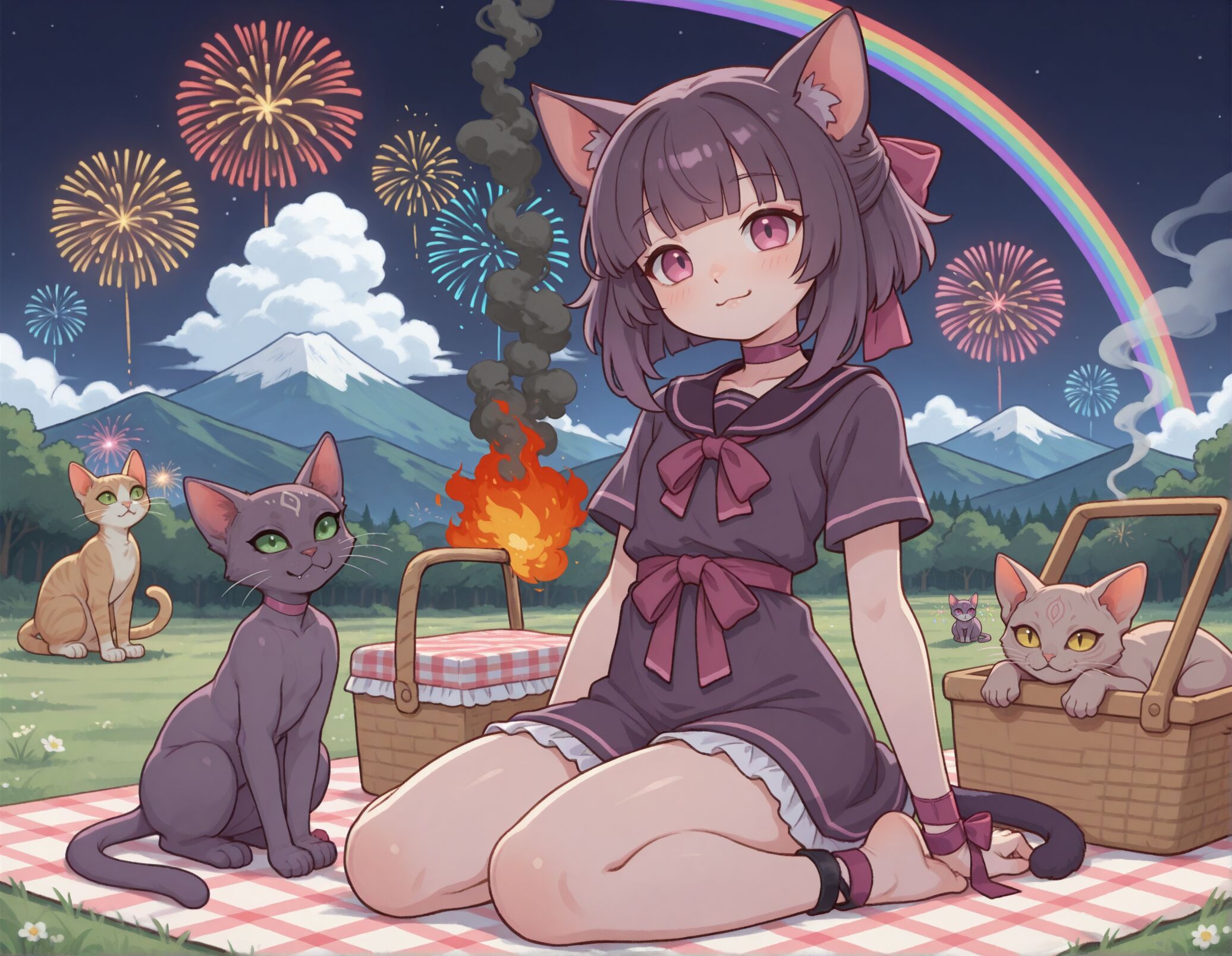 >>106302321The image shows a whimsical anime-style scene of a cat-themed picnic during a festive evening. A girl with cat ears and a short bob haircut is sitting on a picnic blanket, surrounded by several cats. She’s wearing a dark sailor-style outfit with a big bow, and she looks content and relaxed.Around her:There are four cats nearby—each with distinct colors and personalities. One gray cat sits proudly beside her, a tan cat looks upward at the fireworks, and another beige cat lounges lazily in an open picnic basket.Behind them, there’s a campfire or small flame (perhaps from a grill or a lantern) and a couple of picnic baskets with a red-and-white checkered cloth.In the background, Mount Fuji rises majestically under a night sky, while colorful fireworks burst above and a rainbow arches across the scene, adding a dreamy touch.The overall mood feels serene and magical, like a midsummer celebration in a fantasy world where humans and cats share a gentle evening under the stars.
