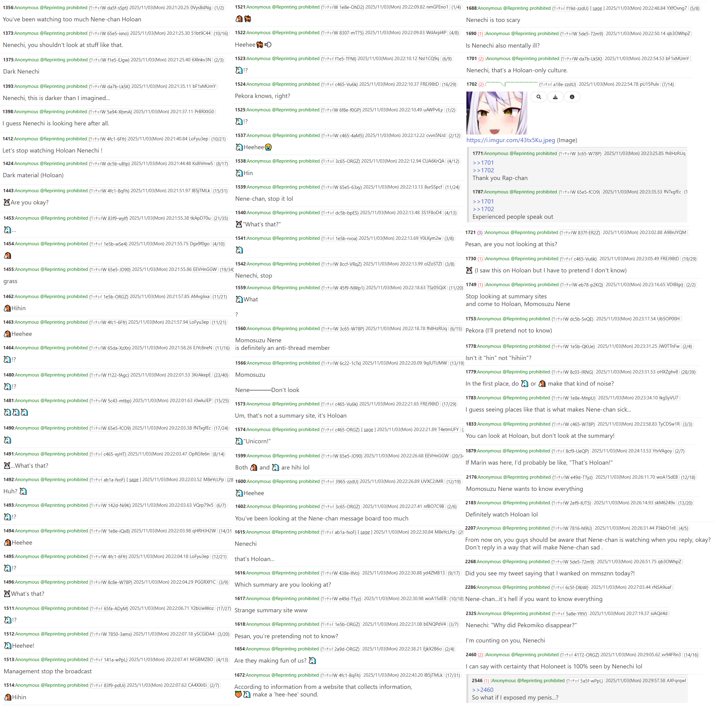 >So it seems that Nene's discussion stream with Pekora was a quasi-venting stream (which is not a surprise for those who even just casually watch Nene), in which she effectively asked for advice from Pekora, who is unironically a mature and professional senpai. And Pekora did excellently, including giving Nene some very good advice that she probably will listen to.>In any case, I think it's been a while, but at the end of the stream Nene hit Pekora with a "what do you think about the current Hololive", and they talked about it for 10-ish minutes, during which Pekora brought up three interesting things.>Firstly, she brought up a slightly different perspective, in that she thinks the current Hololive has a lot of rules and one has to confirm everything and it's certainly tough, but it's not so much that the earlier Hololive was more lenient or understanding or anything like that, but rather that there were actually pretty much no rules back then, and Cover is a big company now and so there are rules now, and it is not possible to "go back", whatever that might mean.>Secondly, she acknowledged/emphasized that both talents and management are more or less in it together, and specifically that the recent-ish string of graduations hit not just the talents but the management hard too, and the mood of the entire company is darker than before. And she saw more clearly now how both talents and management have been trying harder to meet in the middle, at least generally speaking.>And thirdly but definitely not least, Pekora brought up the aspect that Cover is ultimately a company, with everything that entails. Specifically relevant to the talents, what is perhaps most important for them to pay attention to is "interpersonal relationships", or rather "ningenkankei", which is a Japanese term with a whole lot of connotations.>More concretely, from the talents' perspectives, it's less so about "management" as a nebulous entity, and more so about specific managers and staffs. For one example that even viewers can be aware of, the whole system of having newbie managers "trained" by working their way up from easier to harder-to-work-with talents is effectively extra duty for the talents too. And more generally, talents do have to care a lot about interpersonal relationships, particularly with the managers/staffs, and this is both just what working for any company is like and also unquestionably a mental weight.>So, all in all, I guess Pekora did sense what Nene really wanted to talk about, and she approached all the questions from a professional perspective. Personally I think her answers were all quite insightful, and also she struck a balance between acknowledging Nene's (currently probably more on the negative side) opinions of Hololive while also explaining things from a bird's-eye view, which is very impressive.