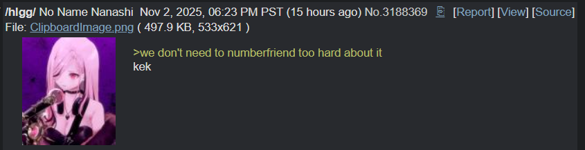 >>106281854Mori referenced numberfriending on stream last nightShe was the most confirmed /here/ of the ENs but we now have her blessing as THE MOST