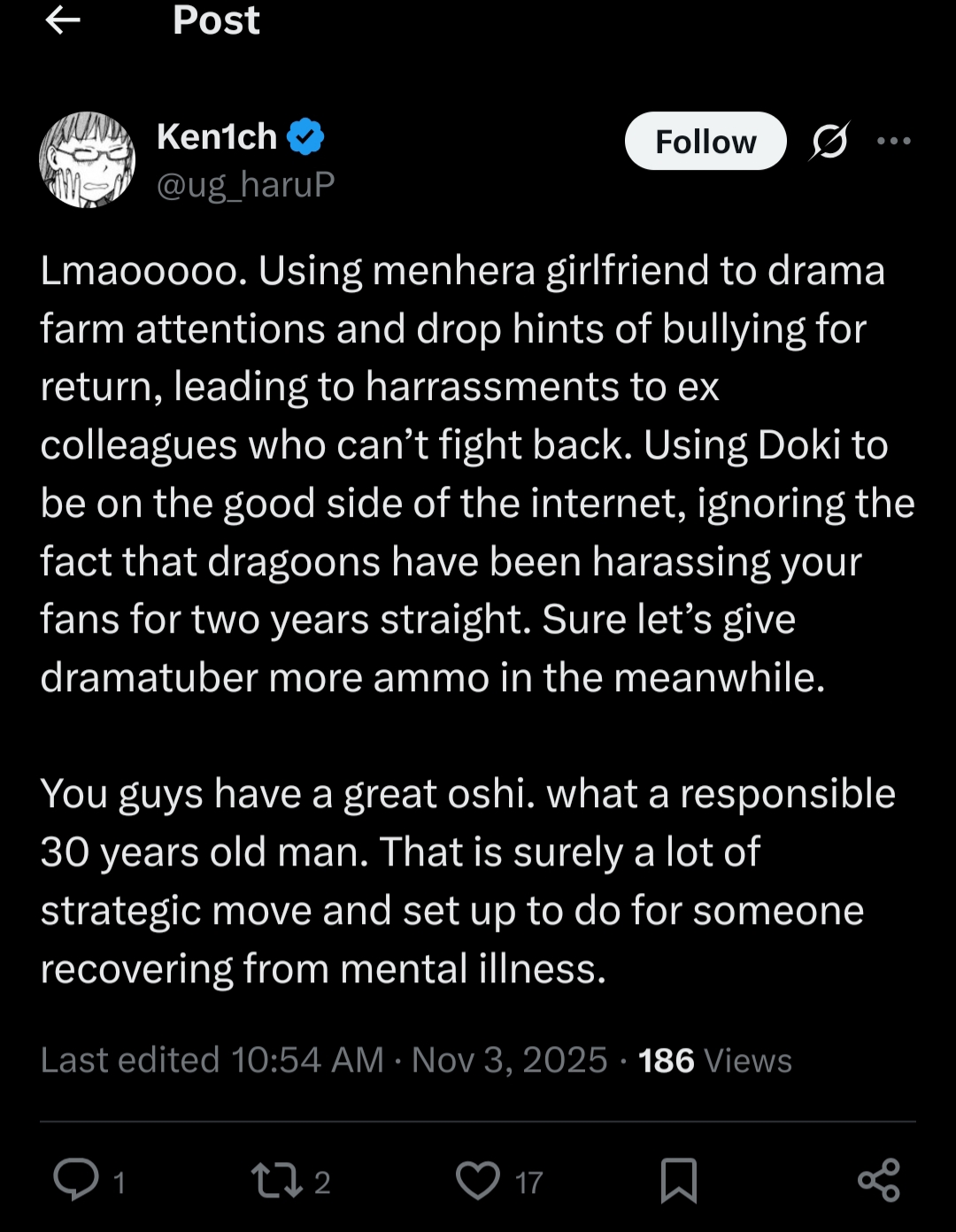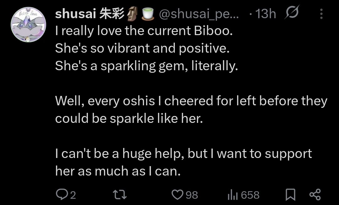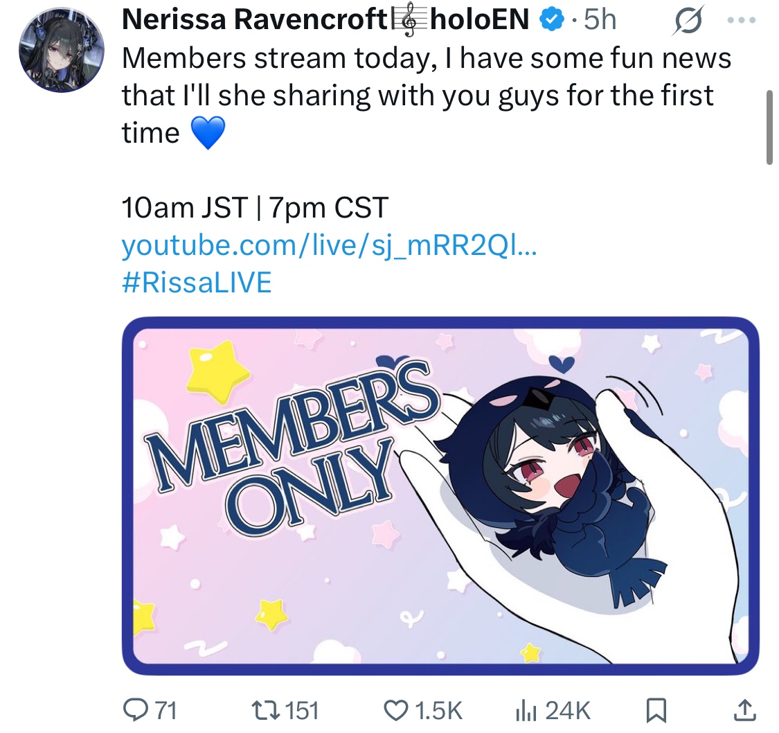 >>106289494>The EN vtubing world outside of HoloEN is bigger than HoloENThat’s not true for ANY metric that doesn’t correlate with “number of channels”. Outside of the ex Holos, there is no subset of English speaking vtubers that comes even close of HoloEN