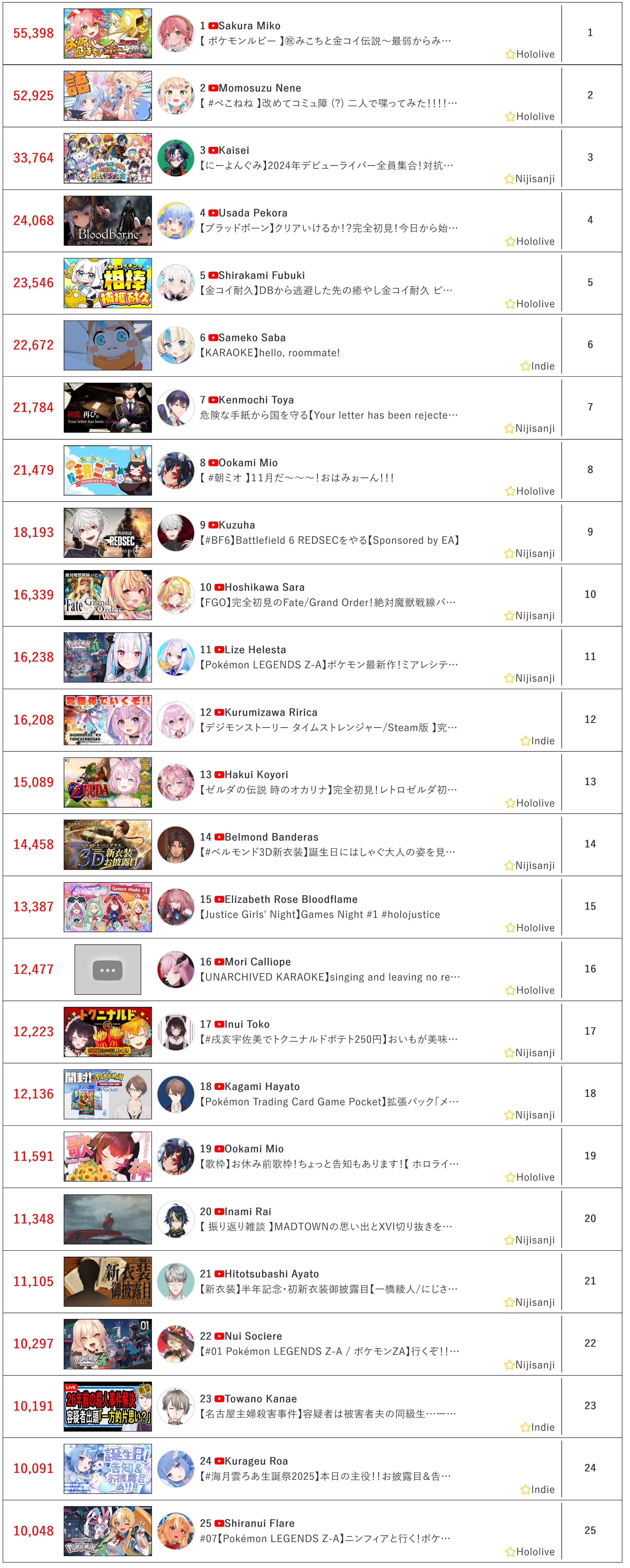 *GENERAL NUMBERFAG SITES*>https://playboard.co/en/>http://ikioi-ranking.com/>https://vrabi.net/>https://www.vstats.jp>https://live-ranking.userlocal.jp/vtuber-ranking>https://vt.poi.cat/Hololive sites>https://www.hololyzer.net/youtube/index.html>https://trackholo.live/en/>https://holo-spotify-stats.jirikunes.eu/Twitch sites>https://sullygnome.com/>https://twitchtracker.com/>https://stats.roki.sh/>https://streamscharts.com/