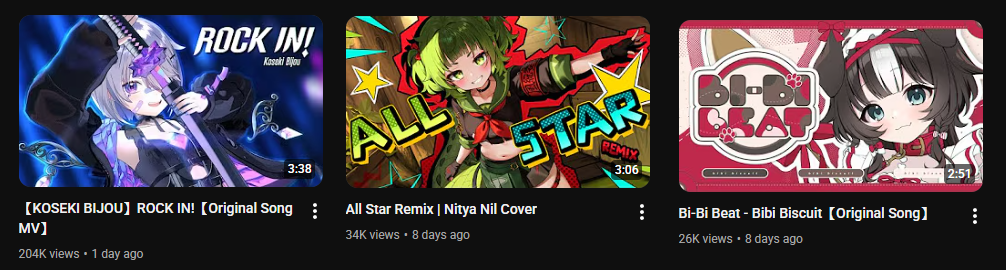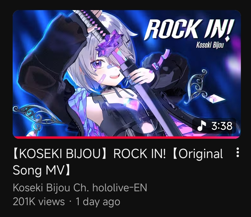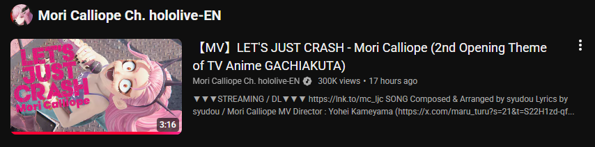 >>106282539https://youtu.be/Y6T0jR6Y_0sEN songs in the Hololive weekly top 100 Oct. 26-Nov 1 (1st week songs excluded):>97) ABOVE BELOW (Justice) - 38,162 views>80) Kira Killer (Zutomayo ft. Mori Calliope) - 42,778 views>78) Kaibutsu (FUWAMOCO) - 43,359 views>68) Go-Getters (Mori Calliope) - 48,922 views>64) All for One (HoloEN) - 52,471 views>58) KING (Gawr Gura/Mori Calliope) - 53,878 views>57) Love Me Love Me Love Me (Nerissa Ravencroft) - 53,894 views>40) Daidaidaidaidaikirai (Hakos Baelz/Ouro Kronii) - 65,894 views>38) Gacha×Gacha ADVENTURE! (Raora Panthera) - 67,772 views>34) Team Tomodachi (Advent) - 74,217 views>27) I'll still be here (Gigi Murin) - 91,666 views>18) Orpheus (Mori Calliope) - 117,341 views>12) TAKEDOWN (AmaLee/Bao/Mori Calliope) - 140,116 views>7) Ash Again (Gawr Gura) - 174,657 viewsNew:>Dynamite (Nerissa Ravencroft/Aokumo Rin) - 376,293 views>Deep in Abyss. (Ninomae Ina'nis/Nanashi Mumei) - 215,942 views>Gehenna (IRyS/Nanashi Mumei) - 260,336 views>Prisoner (FUWAMOCO) - 104,988 views>Kasoukyousoukyoku (Kankan/Nanami Urara/Hakos Baelz - 27,491 viewsNotes:Holotori Dance, Hot Limit, and Escalate fall off the list. Raora and Gigi make the list in their first qualifying week. Biboo's Rock In and Mori's Let's Just Crash are new next week.