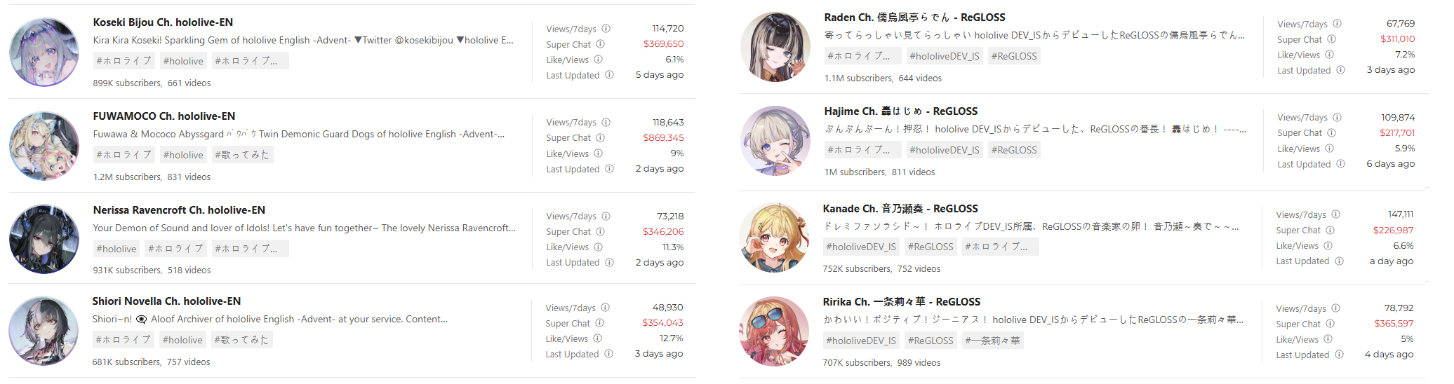 >>106289116I only care about numbers really and for those specific gens, sub-growth, daily ccv, sc's. Dont care about vtubers as a whole, seeing as how so many outside of Hololive are majority botted.