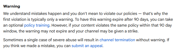 >>106305057Nevermind I actually looked it up. It looks like 2 warnings count as a strike, and the warning stays on your channel for 90 days
