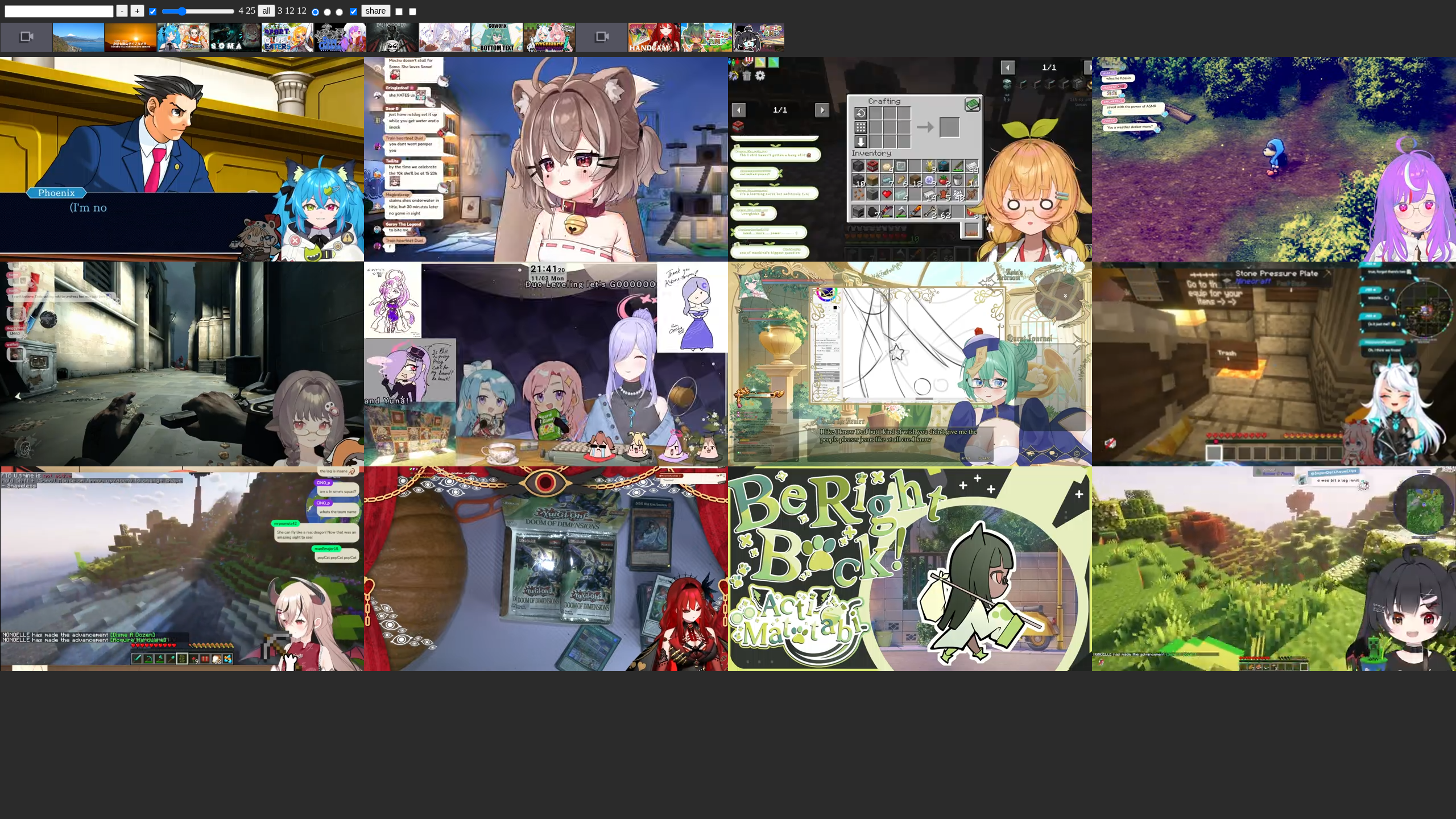 I'll usually have multiple tabs running, but only one non-muted. Usually when corpos and indies or small corpos are streaming at the same time. Multiple picture-in-pictures if a collab is running on YT, again with most muted. I've never used Twitch, so I wouldn't know if I can stream those at the same time. Closest I've ever been is watching a multi-stream with the Doob.Shame I'll never have a full-member setup for a Sloppy Sisters collab.